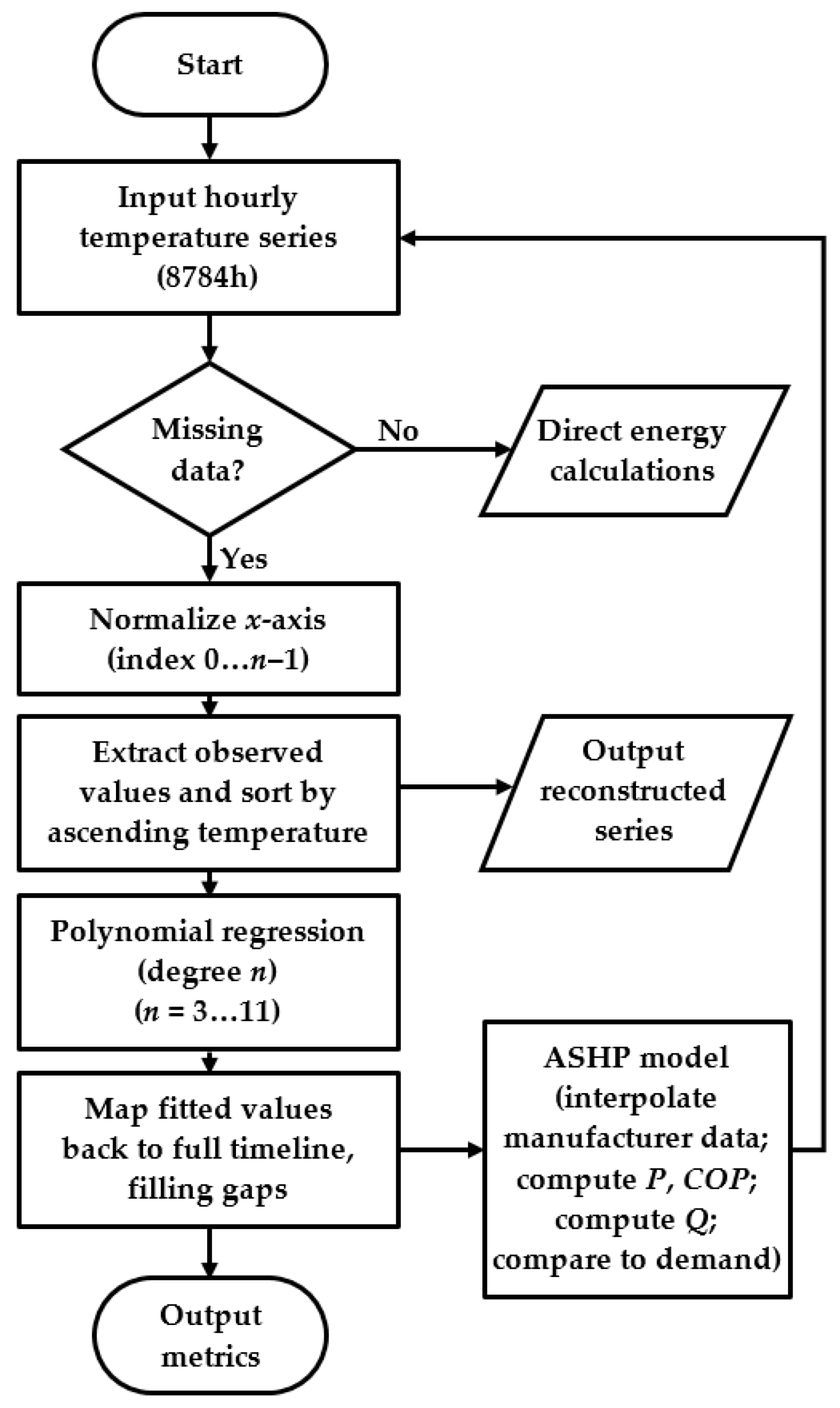 - Calculation of seasonal results: heat demand , electricity consumption (for LWT = 35 °C and 45 °C), and the seasonal coefficient of performance SCOP. Accuracy was assessed by determining MAE, RMSE, R2, ΔQseason, ΔEel, ΔSCOP, and separately, RMSEobs and RMSEfill.
