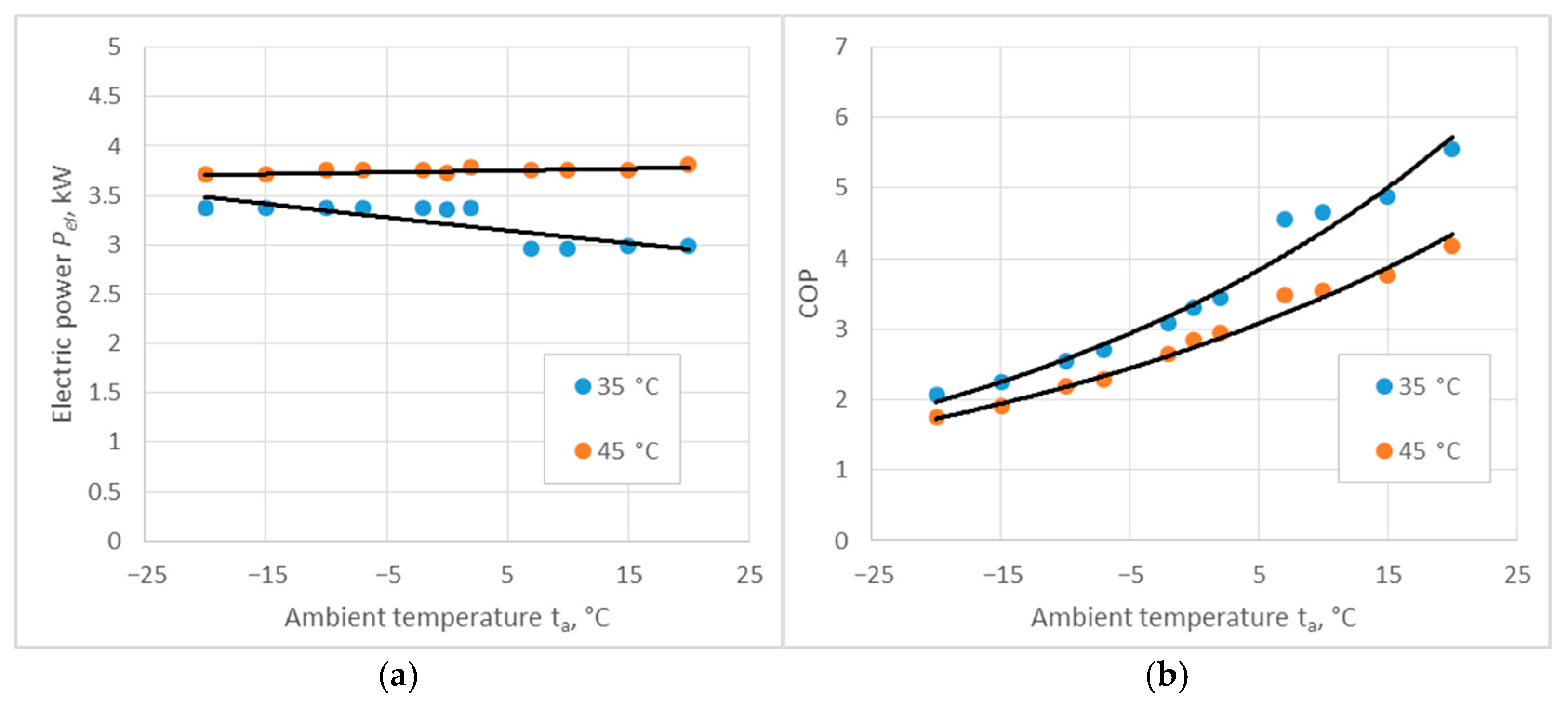 - Sieres, J.; Ortega, I.; Cerdeira, F.; Álvarez, E.; Santos, J.M. Seasonal Efficiency of a Brine-to-Water Heat Pump with Different Control Options According to Ecodesign Standards. Clean Technol. 2022, 4, 542–554. [Google Scholar] [CrossRef]