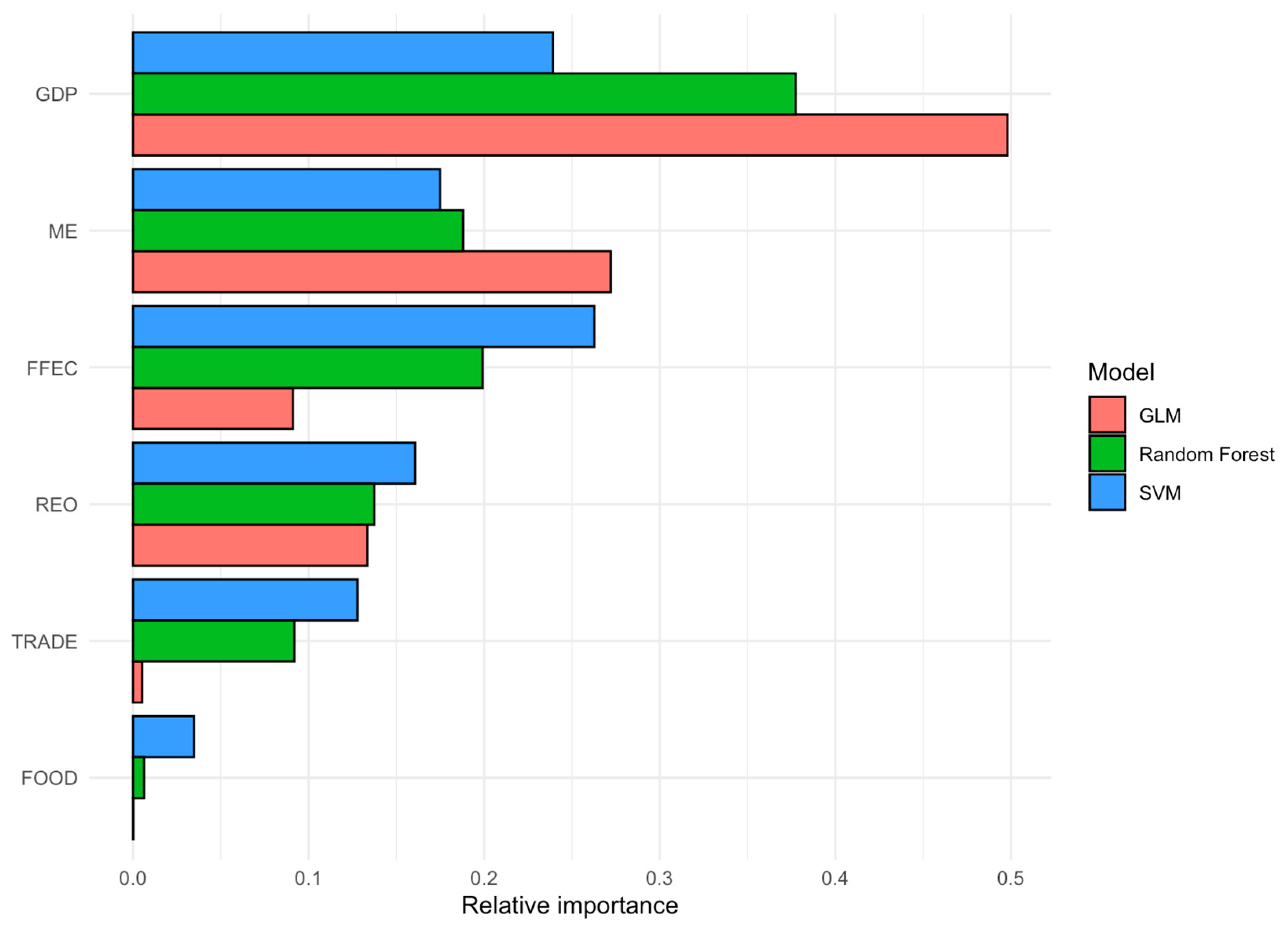 Table 1, the pattern is consistent overall across individual models, with strong scale effects even after conditioning on the energy mix, methane, trade, and food. Contrasts across learners help explain these allocations. The GLM concentrates explanatory weight on GDP and ME and assigns only modest roles to FFEC, REO, and TRADE. By comparison, both the SVM and RF reallocate some weight from GDP and ME to FFEC, REO, and TRADE. Two forces likely matter. First, the strong association between REO and FFEC in