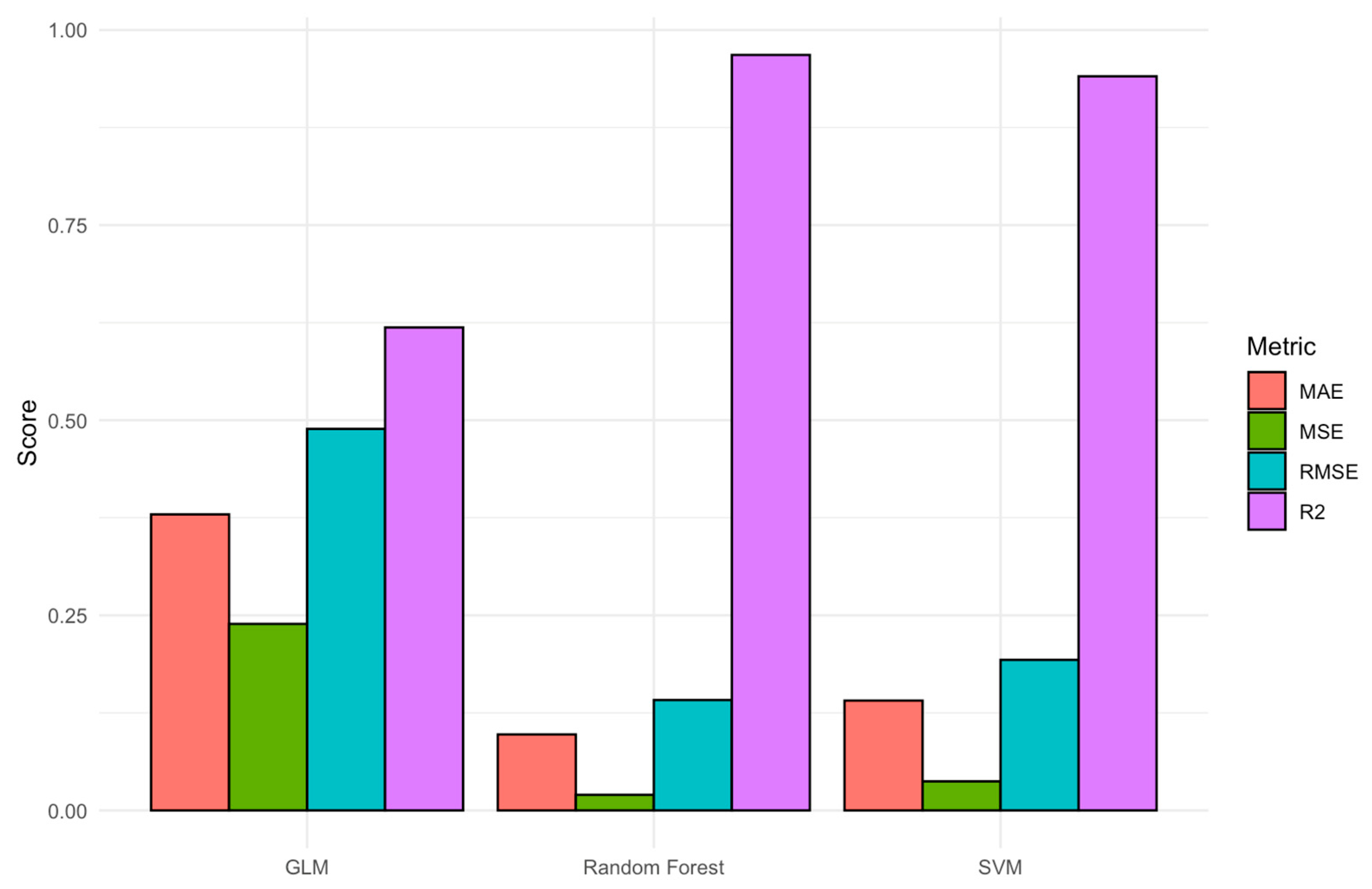The RF model attains the best scores on every error metric and the highest R2; the SVM comes second, and the GLM lags. This ordering lines up with the data features we documented earlier in the previous section: heavy right tails, multimodality in several regressors, and plausible interactions between scale and the fuel mix. Kernel smoothing and tree ensembles can absorb structures that would otherwise be missed without prespecifying functional forms, while single linear coefficients, even on standardized inputs, are less forgiving in this sense.