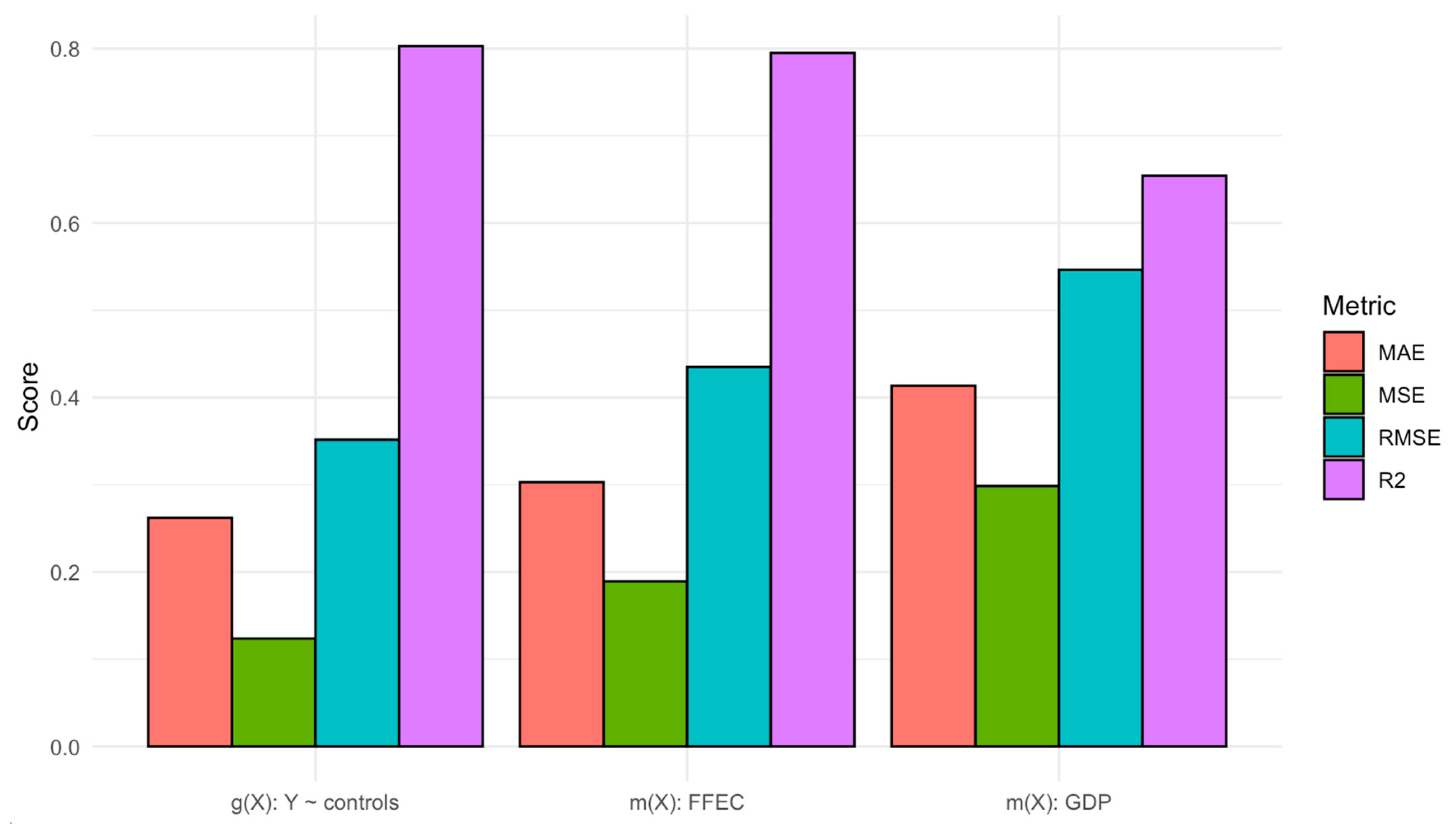 The robustness of the main patterns was therefore checked with DML-built RF nuisances. The choice for this setting was fairly simple: in the headline comparisons, RF delivered the best out-of-sample fit, and DML let us estimate treatment-style effects while still flexibly partialing out the remaining covariates through cross-fitted machine learners. Concretely, we treated FFEC and GDP as the treatments of interest, kept ME, REO, TRADE, and FOOD as controls, centered and scaled all variables, and used an outcome-stratified 80–20 train–test split. RF with 500 trees (the same setting as in the main empirical testing) was used for the nuisance steps, with five-fold cross-fitting to help curb overfitting. After fitting, we evaluated (1) how well the nuisance learners predict and (2) how much each treatment and control contribute to the final structural predictor using essentially the same permutation-importance routine as the main models in