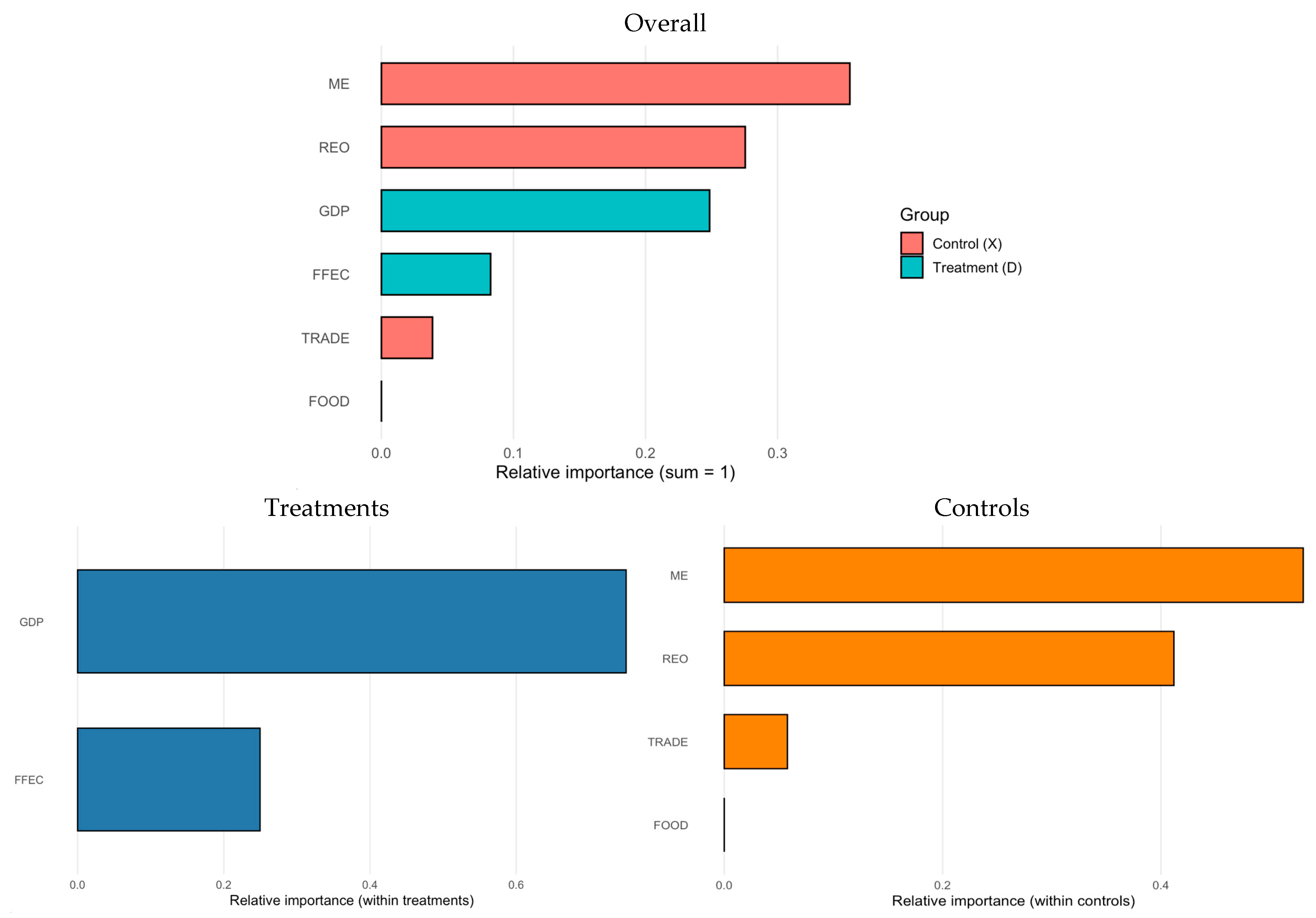 Within the treatment block, income, proxied by GDP per capita, accounts for the larger share of the structural predictor, and FFEC takes the remainder. Within the control block, ME leads, REO follows, TRADE is minor but not clearly negligible, and FOOD is essentially absent. These bars are normalized within the group, so they rank importance relative to peers rather than in absolute terms. Even so, the ordering echoes what we saw in the predictive learners in the previous section: economic scale first, then methane and the fuel mix, and then renewables and trade, with food production close to zero.
