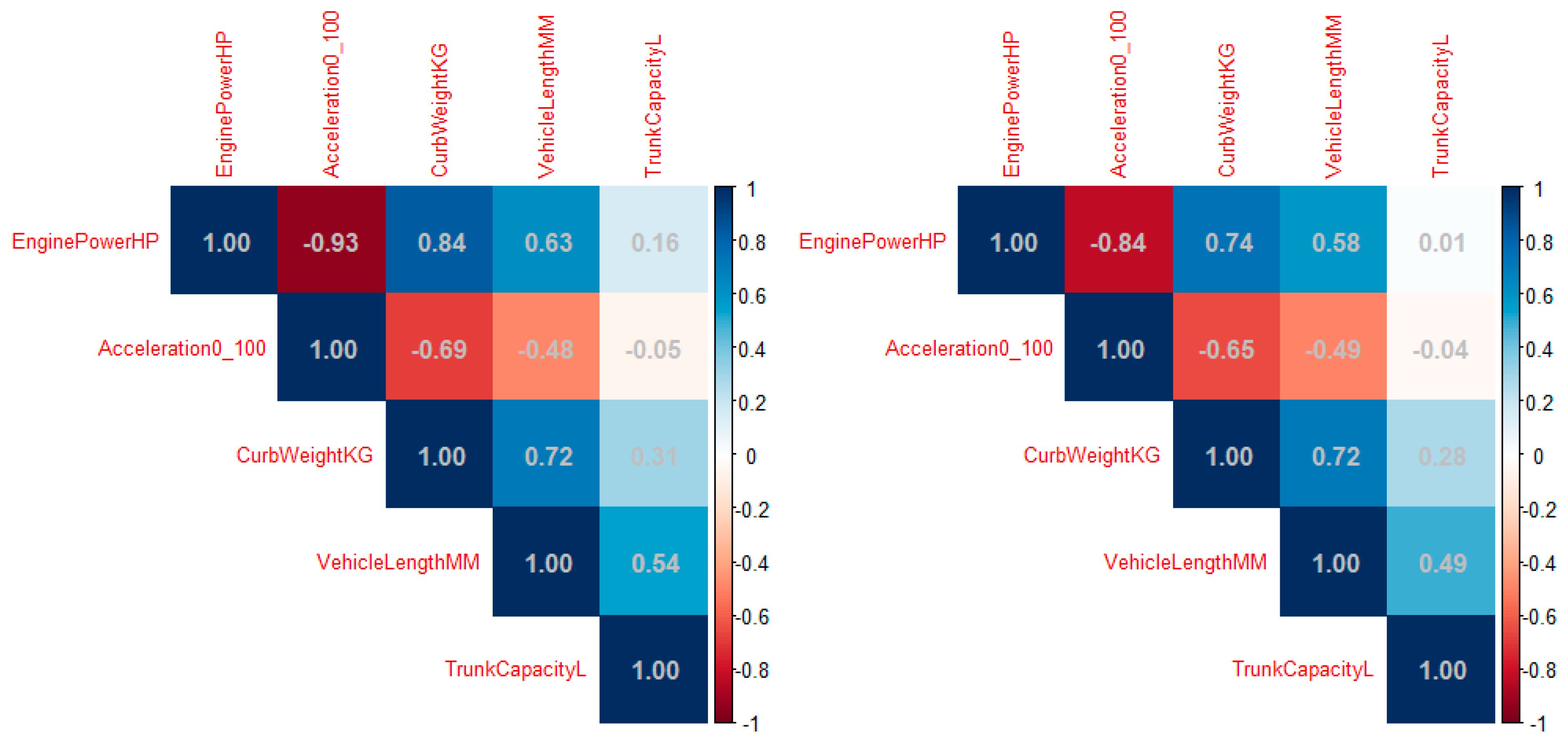 The analysis of Pearson’s and Spearman’s correlation coefficients indicates a high degree of consistency between the results obtained with both methods. The technical variables of vehicles are moderately or strongly correlated, which aligns with theoretical expectations and industry knowledge—higher engine power is usually associated with greater curb weight, faster acceleration, and larger vehicle dimensions. The only exception is trunk capacity, which shows no significant correlation with engine power or acceleration. This suggests that it provides distinct informational value, which may enhance group separability in the clustering analysis.