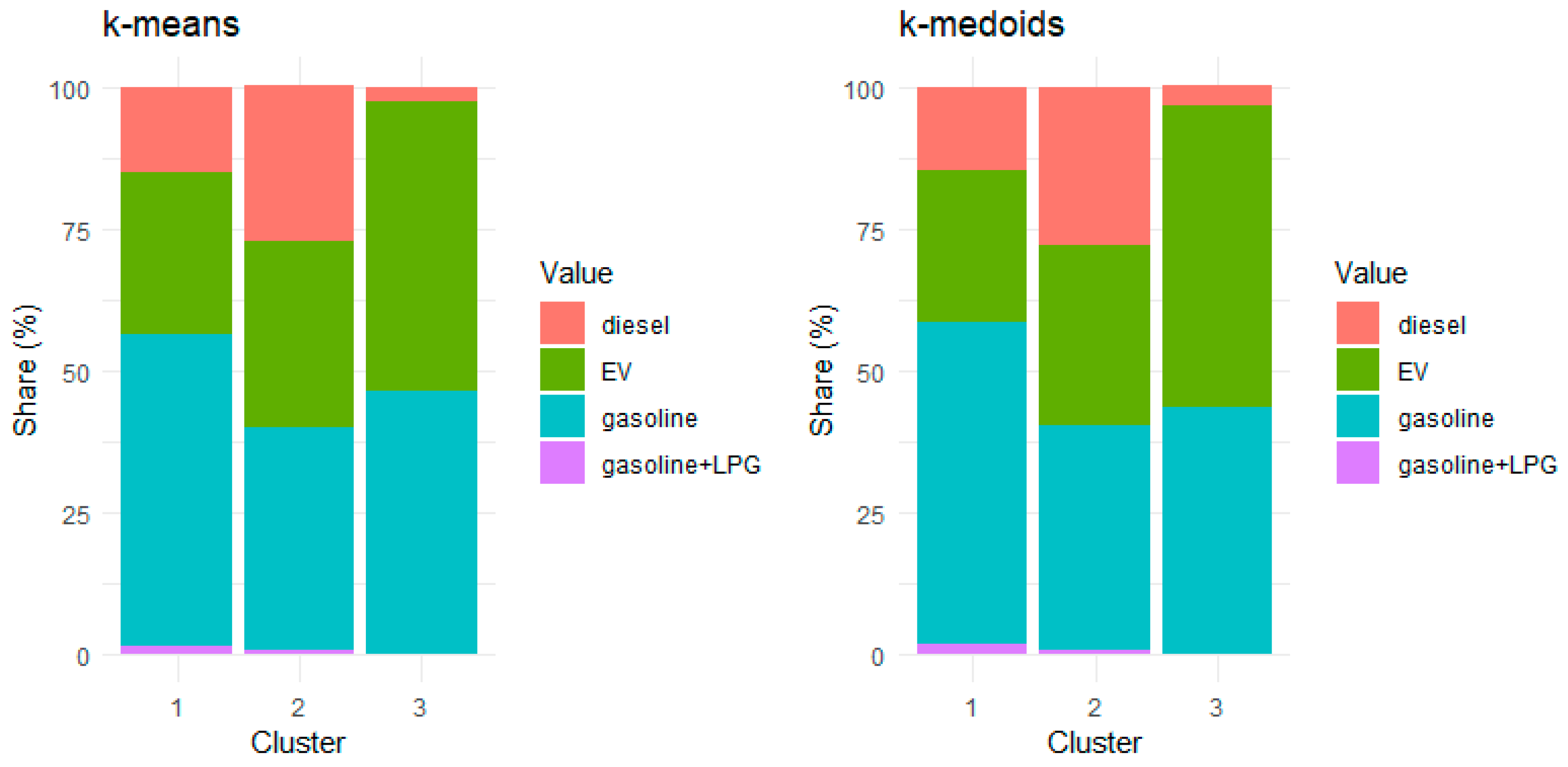 In both cases, the same pattern was observed—the highest share of electric vehicles (EVs) appeared in cluster 3, while the lowest was recorded in cluster 1. This reflects a high degree of consistency in cluster composition across both algorithms.