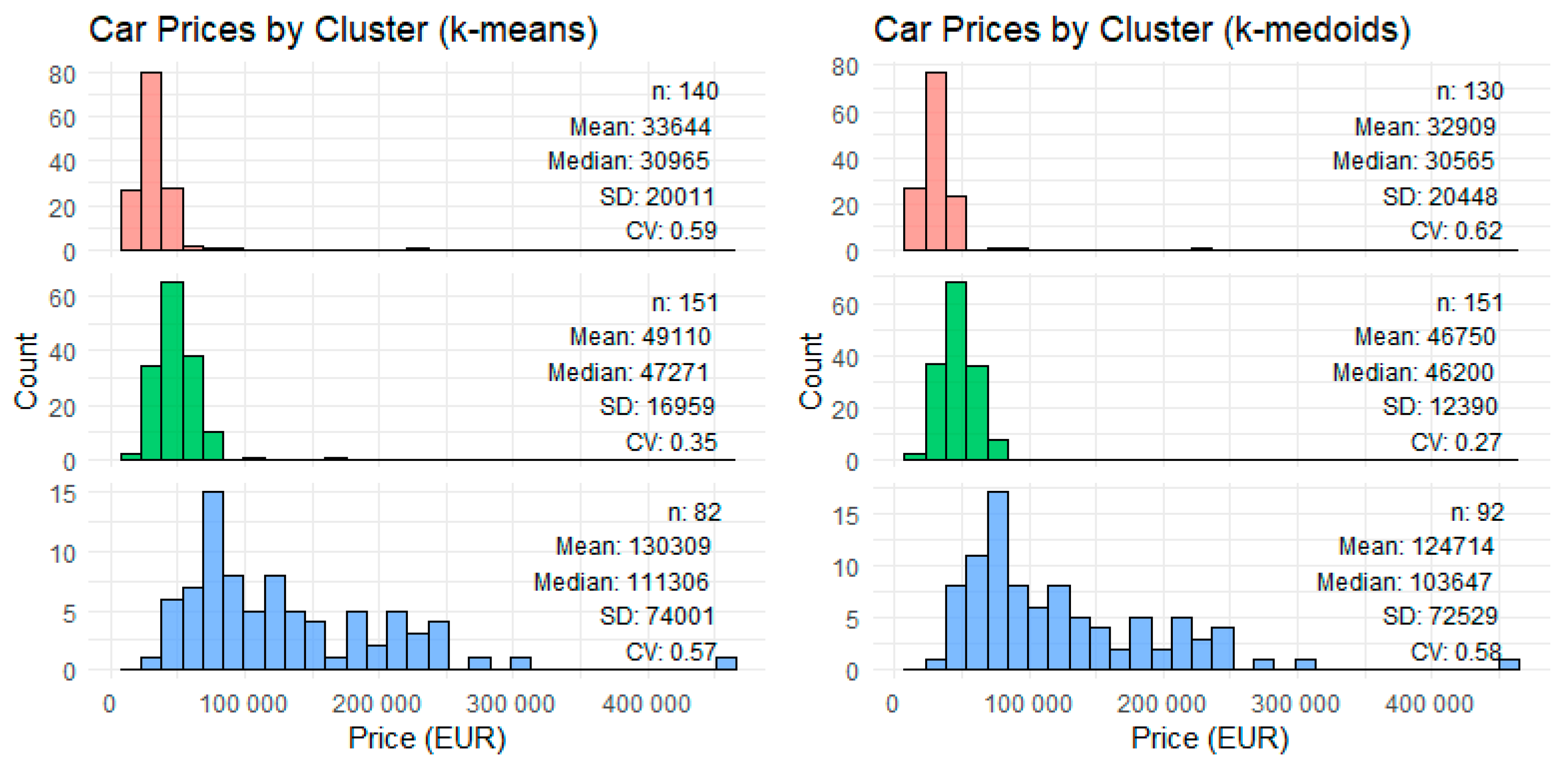 In both methods (k-means and k-medoids), a clear concentration of observations can be seen in the first two clusters. Prices exhibit an ascending pattern across clusters—cluster 1 consists of the least expensive vehicles, cluster 2 represents the mid-range segment, while cluster 3 includes the most expensive cars. The price distributions within each cluster show right-skewness, indicating the presence of individual observations with substantially higher prices than the average. This intra-cluster variation supports the use of the ±2 standard deviation threshold as a valid criterion for identifying price outliers as the criterion for identifying “overpriced” or “underpriced” vehicles is justified.