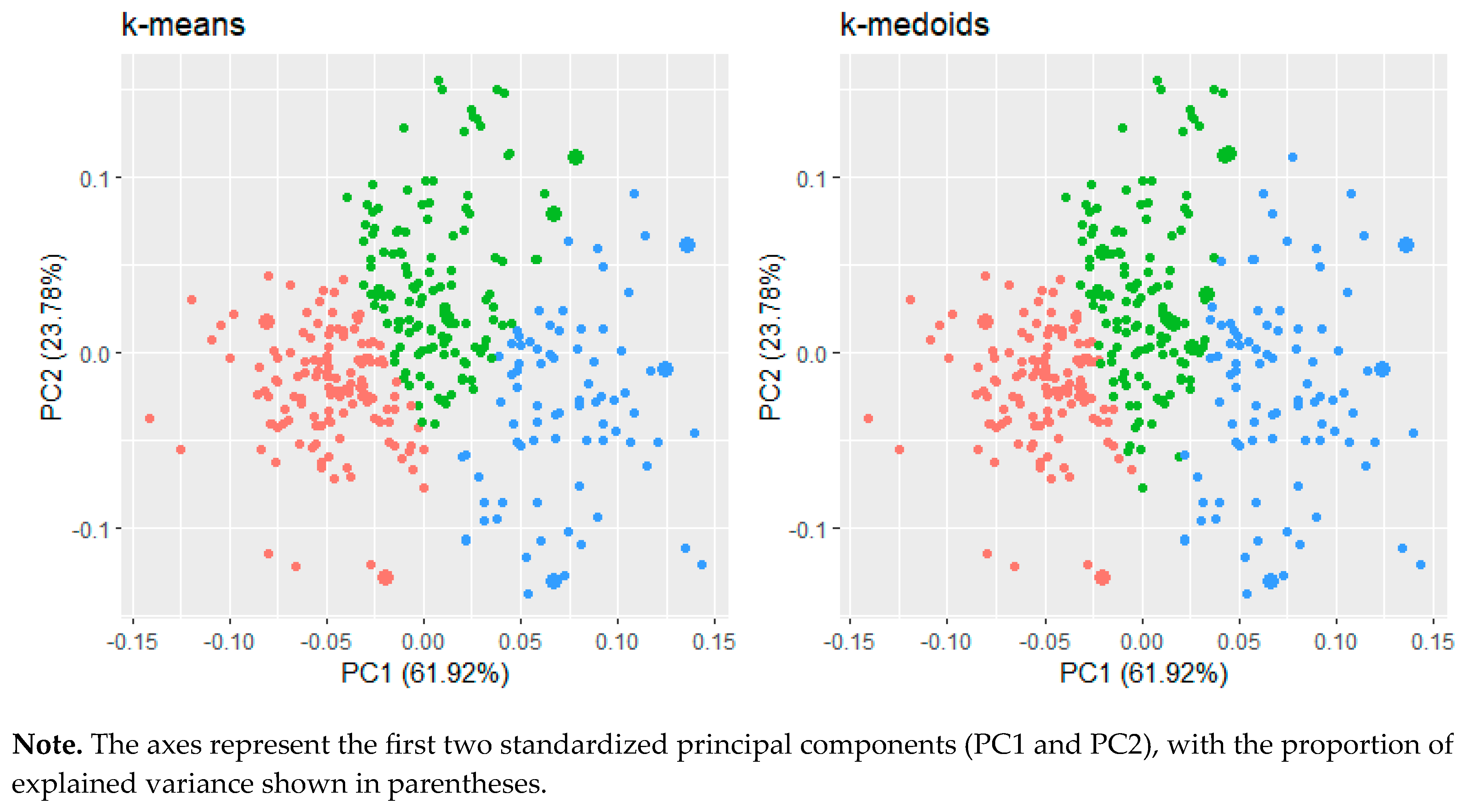 To assess the robustness of the results, an alternative analysis was also conducted using the k-medoids algorithm. Unlike k-means, k-medoids does not rely on averages but on actual observations as cluster representatives (medoids), rendering it more robust to the influence of outliers. Comparing both approaches allows for an evaluation of whether the obtained partition is not merely the result of the specific characteristics of a single algorithm.