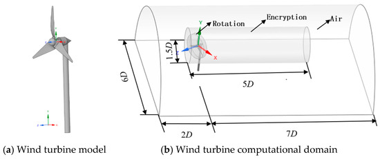 The 3D structural model of the wind turbine was established using a 3D shell structural model, which has structural parameters close to the real physical model [13]. The wind turbine is modelled 1:1 using 3D modelling software (SolidWorks), as shown in Figure 2a. The computational domain is constructed using modelling software as shown in Figure 2b. The rotation domain and the encryption domain are connected via an interface. We define the hub centre for designing the wind turbine as the coordinate origin O, with the Z-axis in the opposite direction to the airflow wind direction and the Y-axis upwards vertically.