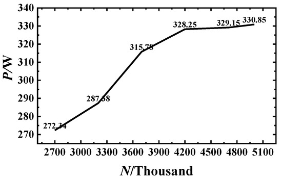 This study employs the Mesh module in ANSYS Workbench to generate tetrahedral and hexahedral meshes for both the flow field and structural domain. Under axial flow conditions, unsteady calculations of the rotor output power were performed using meshes with varying numbers of elements. The results are shown in Figure 3, where N represents the number of mesh elements and P denotes the power output. As shown in Figure 3, when the flow field mesh count reaches 4.2 million, the output power exhibits stable variation with increasing mesh count. The final mesh configuration was determined to be approximately 4.2 million cells for the flow field and 400,000 cells for the structural field, achieving a favourable trade-off in CPU time. Specifically, the blade body mesh has an edge length of 5 mm, while the hub and rotating shaft mesh feature an edge length of 10 mm. The feature clearance dimension is set to 3 mm. The average element quality of the structural mesh is 0.857 > 0.8, meeting the mesh quality requirement standard. The mesh size for the rotating domain is 10 mm, with a contact dimension of 19.5 mm. The refined domain features a mesh size of 50 mm, while the air domain uses a 100 mm mesh size. The curvature capture function is enabled in the boundary layer and rotating domain regions to more accurately describe geometric details, thereby enhancing simulation precision and reliability.