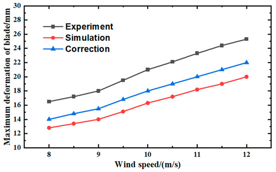 In order to verify the validity of the calculation results, the blade material of the numerical simulation prototype is the same as the experimental wind turbine, which is the same as the experiment in the literature [5] (experimental data in the figure), and the verification calculations are carried out. The solid wood wind turbine blade tip waving deformations at different wind speeds were compared with the experimental values. The results are shown in Figure 4. The tip displacements, equivalent stresses, and equivalent elastic strains of the blade under uniform incoming flow were calculated using the established equivalent model, which were in good agreement with the results calculated in the literature [32], verifying the feasibility of the model for calculations in fluid–structure coupling.