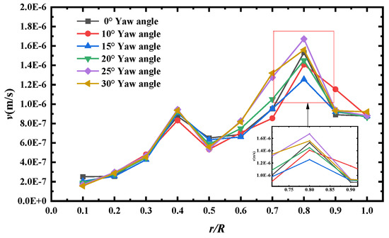 When the air flows over the surface of the blade, due to the viscous fluid, the air velocity close to the surface of the blade is approximately 0; as the distance from the surface of the blade increases, the air is less affected by the viscosity, and the velocity is gradually close to the external mainstream wind speed. This velocity from 0 gradually transitions to the mainstream speed of the thin region, which is the boundary layer. The fluid flow within the boundary layer is called the boundary layer velocity. A boundary layer velocity distribution affect, among other things, is airflow separation. This changes the operational efficiency of the wind turbine and the aerodynamic state of the blades. Figure 5 shows the boundary layer velocity curve of the blade along the direction of leaf spread under different yaw conditions. The figure shows the variation in boundary layer velocity along the blade spreading direction under different yaw angles of the wind turbine. The horizontal coordinate r/R indicates the relative distance of the boundary layer from the blade root, and the vertical coordinate v indicates the average velocity at the boundary layer.