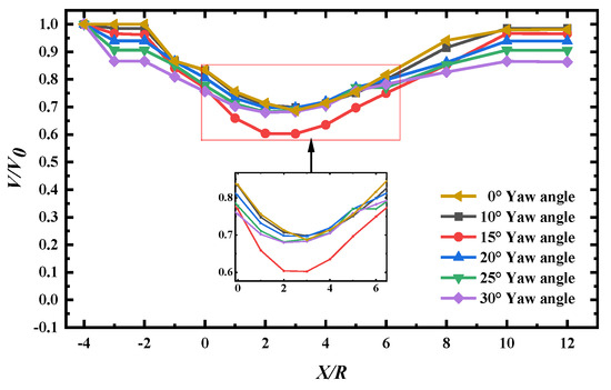 Figure 6 shows the variation in the mean axial velocity of the wake section of the wind turbine under different yaw conditions. The horizontal coordinate represents the ratio of the distance X from the trailing flow field cross-section to the centre of the wind turbine to the diameter D of the wind turbine, and the vertical coordinate represents the ratio of the average velocity V of the trailing flow field cross-section to the incoming wind speed V0.