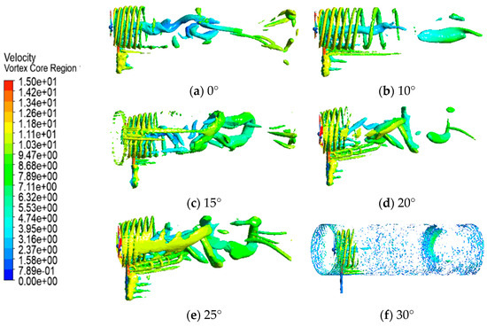 Figure 7 shows the vortex intensity diagram obtained for the wind turbine at different yaw angles. The wake region of the wind turbine consists of tip vortices formed by rotating blade tips and a continuous radial tubular vortex surface as well as a central vortex centred on the hub [33].