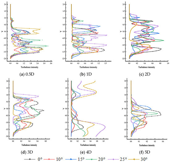 As can be seen from the figure, with the increase in the cross-section of the wake flow field, the turbulent kinetic energy shows the change rule of decreasing and then increasing. At the 0.5D section of the wake flow, the peak turbulence intensity is high and fluctuates violently; at the 5D section, the peak turbulence intensity rises, and the fluctuation of the curve tends to flatten. The reason for this is that, at the 0.5D section near the wind turbine, the wake is strongly affected by blade rotation and aerodynamic interference, and the turbulence intensity is high and complex; as the wake develops downstream, the airflow mixes with the surrounding environment, the momentum is gradually restored, and the turbulence is attenuated due to energy dissipation. Under different yaw conditions, the turbulence intensity changes in different trends. When the yaw angle increases, the turbulence intensity decay process is more complicated, the curve fluctuation is more frequent, and the turbulence evolution of the wake flow field is more irregular after the yaw interference. In the 0.5D cross-section, the wake that is affected by the external doping is small, mainly disturbed by the force acting with the wind turbine, and the difference in the flow field is enhanced in different yawing conditions; in the 5D cross-section, the long-time and long-distance doping causes the wake energy to be dissipated greatly, and the turbulence intensity curves corresponding to the yaw angles tend to be close to each other. The turbulence intensity curves for each yaw angle tend to be close to each other. Fluid bypassing the wind turbine in different wake cross-sections produces different rules of change due to the existence of the yaw angle makes the turbulence intensity become more turbulent, and the turbulent flow field will have an impact on the structural field.