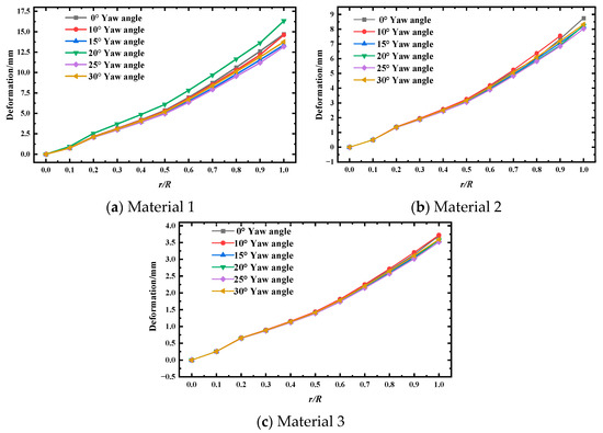 The change in yaw angle causes the aerodynamic loads imposed on the blades by the incoming wind to have a component along the blade spreading direction, and the axial thrust acting on the blades is reduced. Aerodynamic changes affect different materials to different degrees. As the yaw angle increases, the tendency to increase the component of aerodynamic load along the blade spread is also greater, so that the axial thrust acting on the blade decreases with increasing wind speed. At the same time, the existence of yaw angle also has an effect on the centrifugal load, resulting in differences in the increase in deformation at different yaw conditions [20]. Figure 10 shows different materials for a wind turbine with yaw angle increase blade maximum deformation law change distribution.