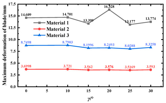 The blades of different materials have different mechanical properties, such as their own modulus of elasticity and strength. Materials 1, 2, and 3, due to the differences in their own properties, have different degrees of stress response under the aerodynamic force caused by the same yaw angle change. The maximum stress values shown in Figure 7 all appeared at the position of a yaw angle of 15°.