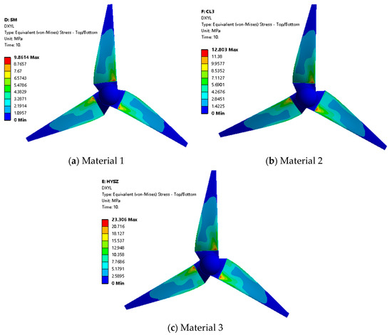 As can be seen in Figure 11, the stress is uniformly distributed on the three materials blades; there is a stress concentration range at the maximum chord length of the blade and the middle of the blade close to the leading edge; the stress at the leaf root of the blade corresponding to material 1, material 2, and material 3 is the largest, which is 9.86 MPa, 12.80 MPa, and 23.31 MPa, respectively; and it can be seen that the strongest resistance to deformation is found at the root of the blade, which is in agreement with the deformation of the leaf tip proposed above The large change rule is consistent.
