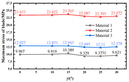 In order to investigate the change rule of blade stress of different materials, the maximum stress value of the blade root of three materials is selected under different yaw conditions, as shown in Figure 12.