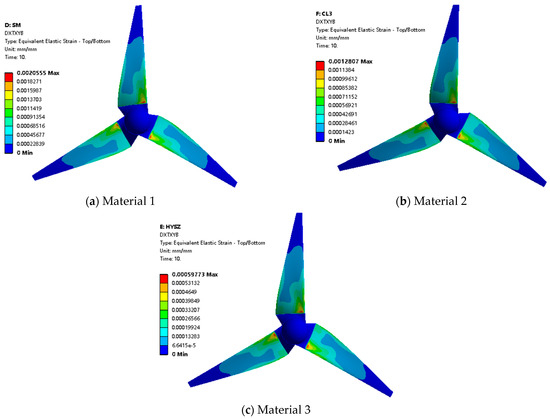 Analysing the cloud diagrams, it can be seen that material 1, material 2, and material 3 correspond to the largest elastic strains at the blade root, which are 2.06 × 10−3, 1.28 × 10−3, and 5.98 × 10−4, respectively. In view of the homogeneous nature of the blade materials, the equivalent strain cloud diagrams and the equivalent stress cloud diagrams show a corresponding relationship, and they are mainly concentrated in the region of r/R = 0.2 to 0.7 [42,43].