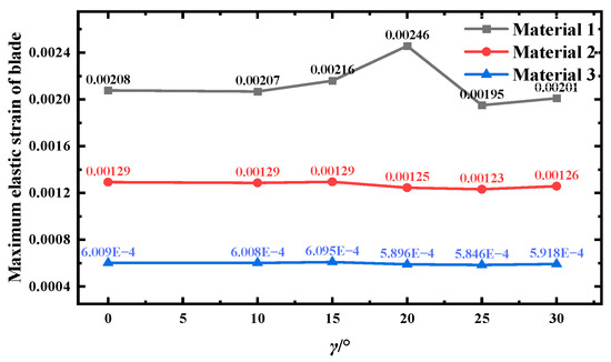 In order to investigate the equivalent strain distribution law of different material blades, the maximum elastic strain values of leaf roots of three material blades under different yaw conditions are selected, as shown in Figure 14.