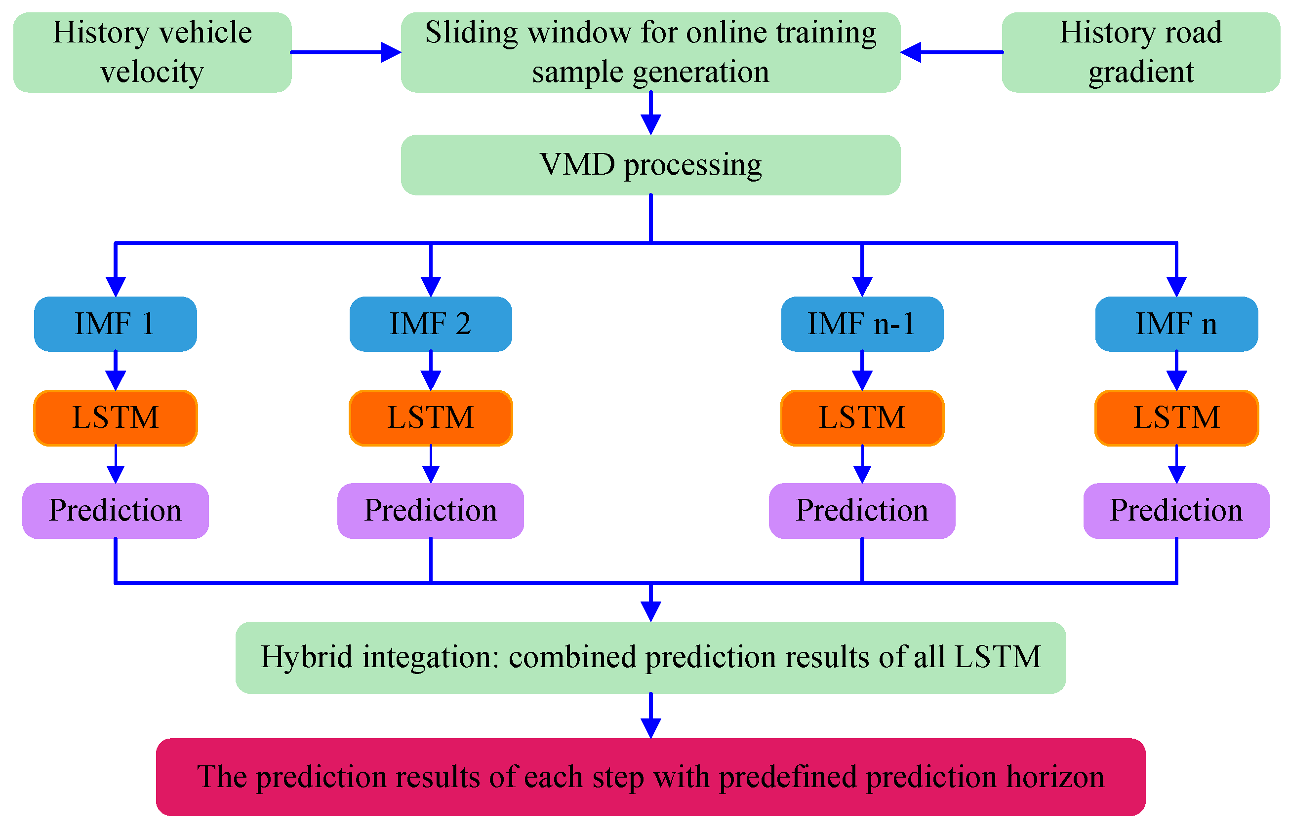 - The proposed VMD-LSTM model significantly improves the prediction accuracy of velocity and road gradient, thus leading to a more accurate power demand prediction.