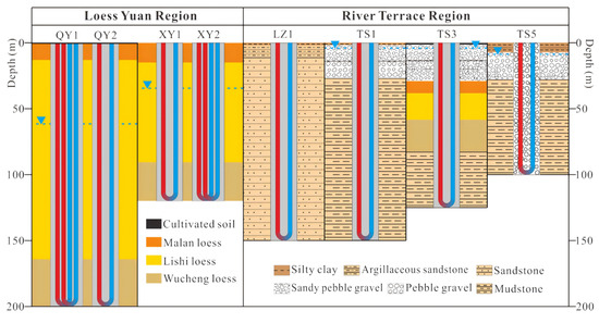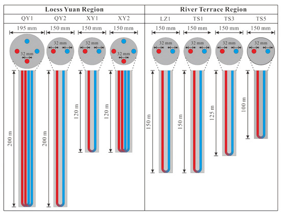 Figure 4 shows the eight boreholes which were installed in two typical regions: the Loess Plateau Region and the River Terrace Region. The boreholes have depths varying from 100 m to 200 m and a diameter of 150/195 mm. Double-U and single-U high-density polyethylene pipes (HDPEs) are used in these boreholes. The gaps between the loops and the ground are backfilled with sand–bentonite mortar and drilling cuttings.