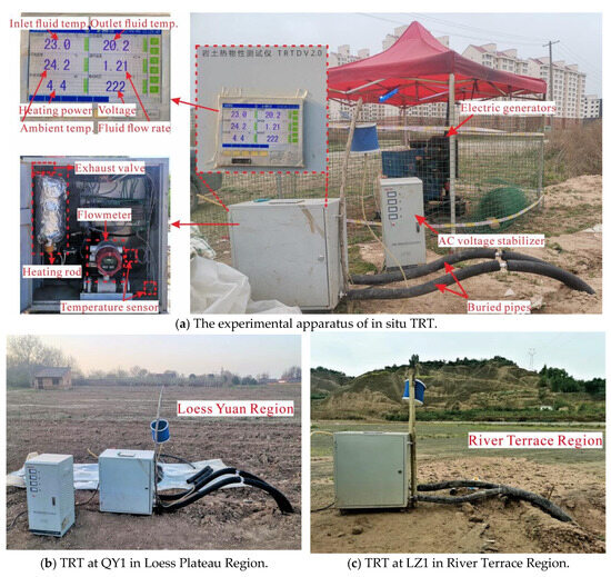 Figure 5b,c and Table 2 show the data obtained during thermal response tests and implementation of TRTs on site in the Loess Plateau Region and the River Terrace Region. The TRT device has a measuring accuracy of ±0.1 °C for temperature and ±0.1 L/s for fluid flow rate. A heater, a water circulating pump, a flowmeter, and all the sensors are assembled in a box, as shown in the left sub-figure in Figure 6.