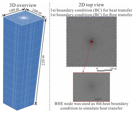 In this study, the two models, vertically discretized with geological layers, have a size of 50 × 50 m (length × width, as shown in Figure 6), and the depth is set to match the BHEs on site. To achieve precise outputs, the meshes around the BHEs are refined 100 times [25].