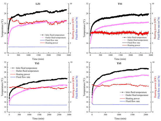 Two sets of TRTs were carried out respectively on the River Terraces and the Loess Plateau in the study area. The records of eight TRTs are presented in Figure 8 and Figure 9. All TRTs are tested for a duration of 48 h with a fluid flow rate of 1.2–1.8 m3/h and heating power of around 4.0–5.0 kW.