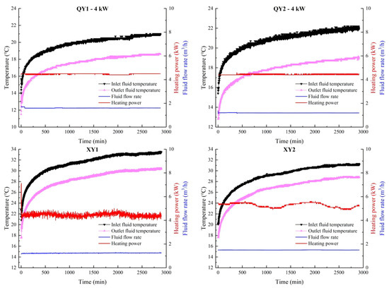 The inlet–outlet fluid data and monitored heating power during the thermal response tests at QY and XY in the Loess Plateau Region.