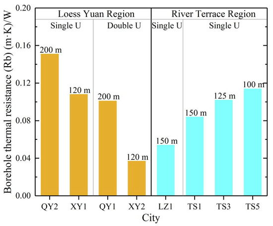 Figure 11 shows the parameters estimated by the 8 field TRT. It displays that the estimated borehole thermal resistance varies from 0.037 (m·K)/W to 0.108 (m·K)/W in the Loess Plateau Region and from 0.054 (m·K)/W to 0.114 (m·K)/W in the River Terrace Region. Firstly, under the same buried pipe structure, the thermal resistance of the boreholes in Qingyang is generally higher than that in Xianyang. In the River Terrace Region, on the other hand, under the same condition of borehole structure, the thermal resistance of the borehole in the Lanzhou area is lower than that in Tianshui. In addition, the smaller the depth of the buried pipe, the higher the value of thermal resistance of the borehole under similar geological background and borehole structure conditions.