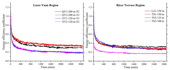 Table 7 shows the extractable specific heat rate of BHE. The specific extractable heat of BHE in the Loess Plateau Region varies between 21.01 W/m and 37.51 W/m with a mean value of 29.25 W/m. For the four TRTs at the River Terrace Region, these values vary from 27.48 W/m to 48.43 W/m, with an average rate of 37.63 W/m. The specific rate of the BHEs in the River Terrace Region was 28.65% higher than that in the Loess Plateau Region due to the lower thermal conductivity of the geological materials [29,30]. As it is calculated in ground thermal conductivity analysis, in Figure 10, the effective conductivity of the ground at the Loess Plateau Region is lower than that in the River Terrace Region.