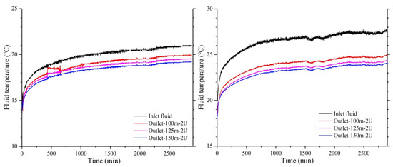 Figure 13 shows the fluid outlet temperature development in two typical geologic settings based on the geological conditions of typical Loess Plateau in QY1. In a TRT, the lower outlet fluid temperature of the BHEs indicates a higher thermal efficiency. Hence, the deeper the buried pipe, the higher the thermal efficiency is. In the Loess Plateau Region, as the drilling depth grows from 100 m to 200 m, the temperature difference between the inlet and outlet increases from 1.0 °C to 1.9 °C. In the River Terrace Region, the fluid inlet and outlet temperature increased from 2.7 °C to 3.7 °C as the borehole depth increased from 100 m to 150 m. In general, the thermal efficiency of BHE in the River Terrace Region is less affected by the depth of the borehole than in the Loess Plateau Regions due to the high heat transfer efficiency of the aquifer.