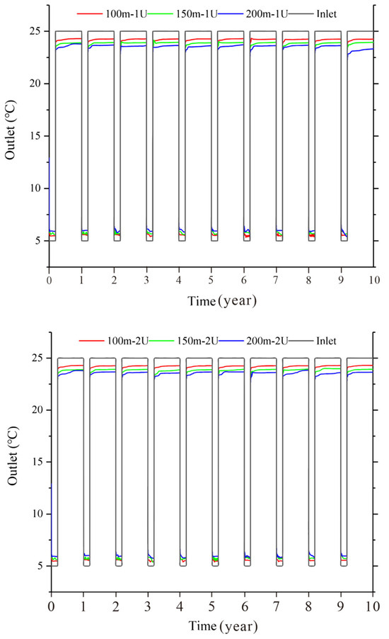 Figure 14 depicts the recorded hourly simulated fluid temperature of the BHEs based on QY1 for the three different borehole depths over a 10-year operation. By comparison, a BHE with a depth of 200 m has an 18.02% and 45.10% higher specific heat rate than that of 150 m BHE and 100 m BHE in the cooling case, respectively. In the heating case, a BHE with a depth of 200 m has on average a 10.02% and 36.42% higher specific heat rate of BHEs than 150 m and 100 m, respectively.