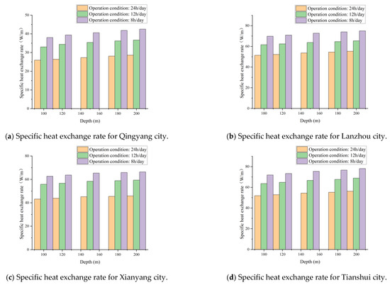 Figure 15 presents the determined specific heat exchange rate of BHEs with five burial depths (100 m, 120 m, 140 m, 180 m, and 200 m) under three operation conditions (24 h/day, 12 h/day, and 8 h/day) for four typical cities in Northwest cities in China. The results indicate that shorter operation durations result in higher thermal performance. This is because the operation of the BHE will cause heat and cold accumulation around the BHE, which in turn decreases heat transfer efficiency gradually. It is noticed that Qingyang city has the lowest thermal performance of BHE. It is mainly attributed to the lowest initial ground temperature, which is only 11.6–12.9 °C, as shown in Table 4. Thus, thermal performance can be sensitively affected by both the ground initial temperature and operation hours.