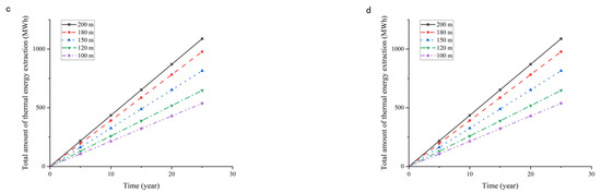 The estimated total amount of heat energy extracted from the ground for the BHE with varying depths in four cities, taking an example for the BHE operation for 24 h/day. (a) Total amount of heat extraction for Qingyang city over a 25-year period; (b) total amount of heat extraction for Lanzhou city over a 25-year period; (c) total amount of heat extraction for Xianyang city over a 25-year period; (d) total amount of heat extraction for Tianshui city over a 25-year period.
