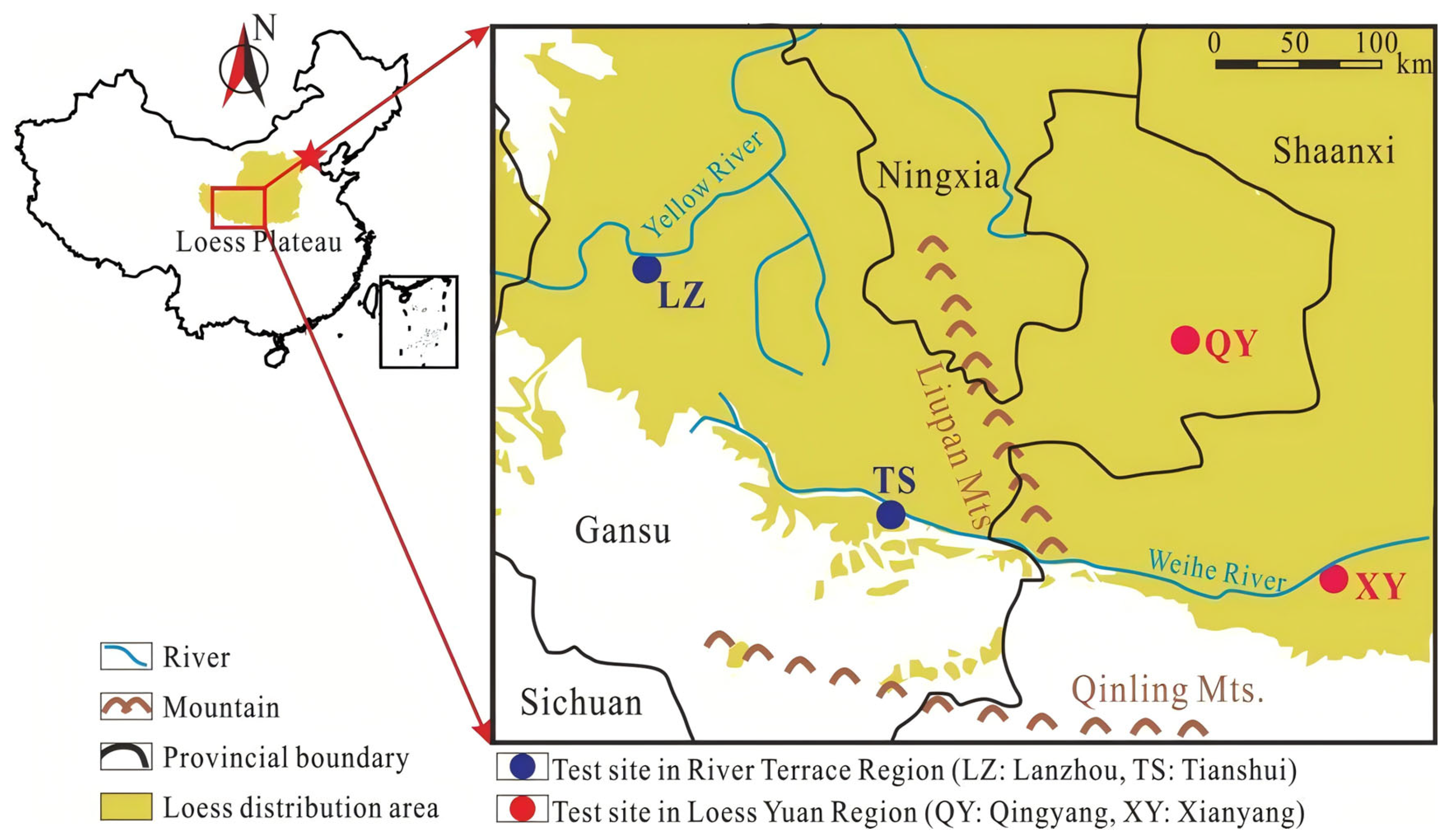 The study area is located in one of the four major climate types in China, of which Tianshui is in the temperate continental climate zone, while the other three TRT test sites in Lanzhou, Qingyang, and Xianyang are in the temperate monsoon climate zone. In Northwest China, loess is widely distributed, which covers approximately 6.6 percent of the total area of China [