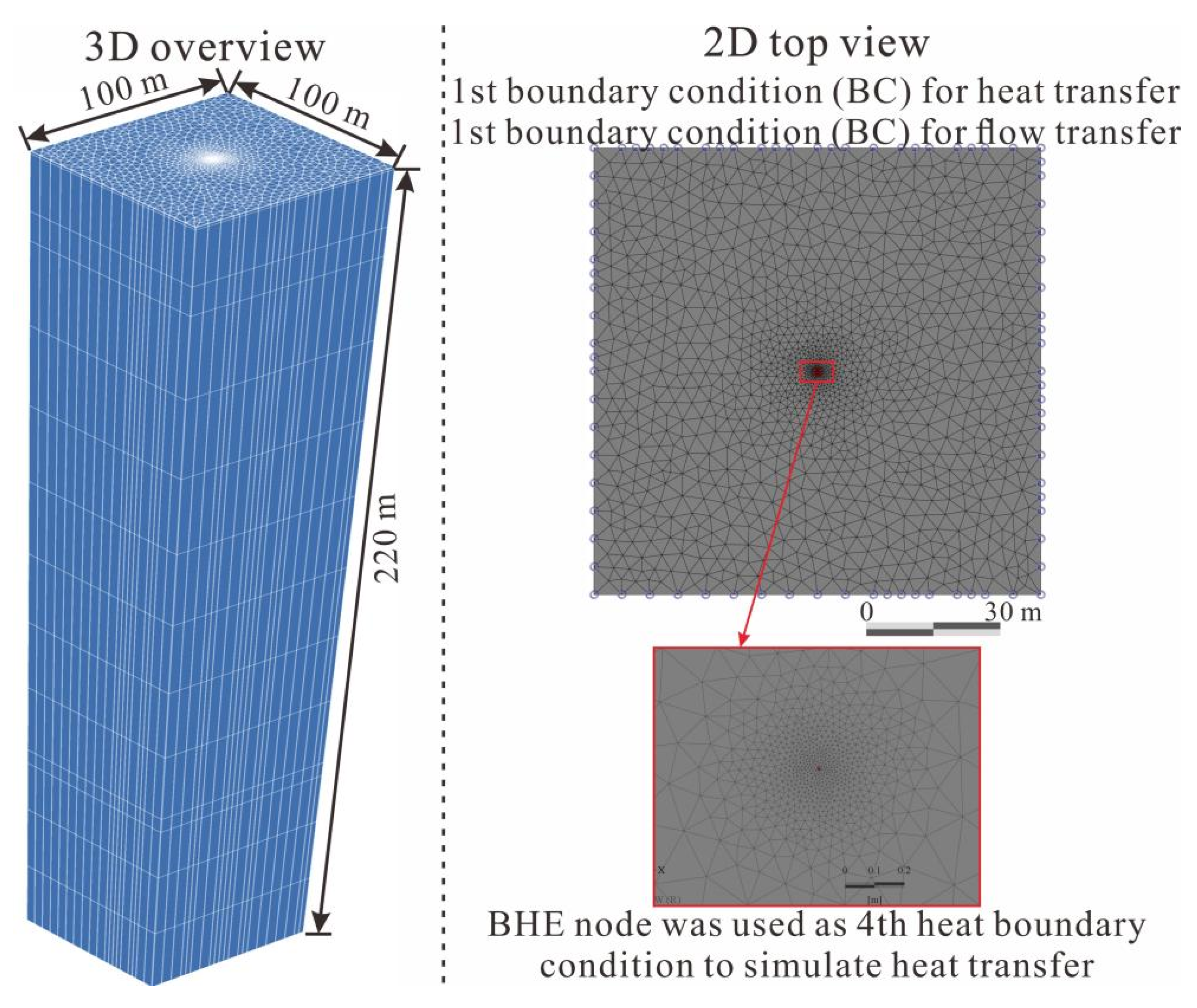Figure 6), and the depth is set to match the BHEs on site. To achieve precise outputs, the meshes around the BHEs are refined 100 times [
