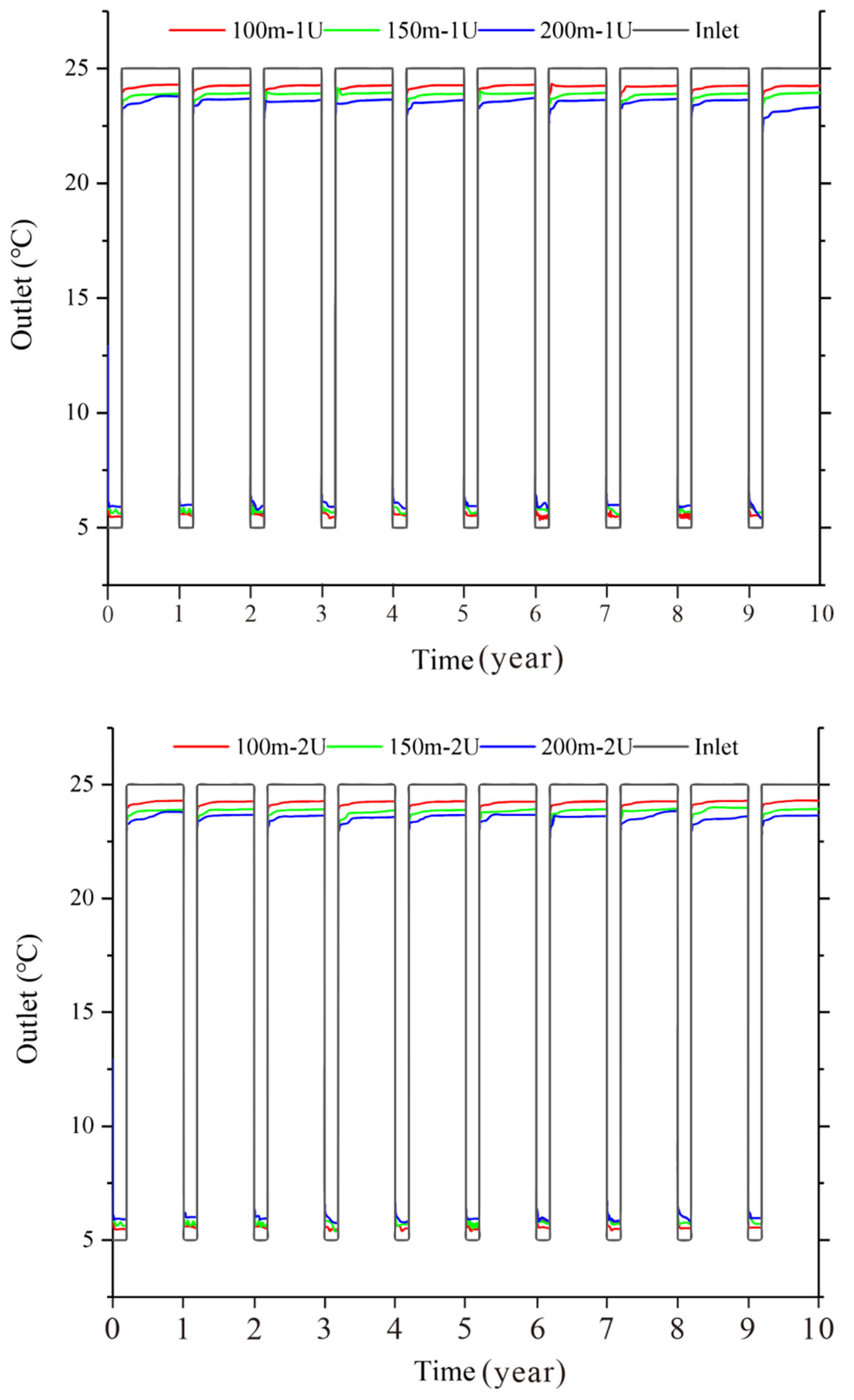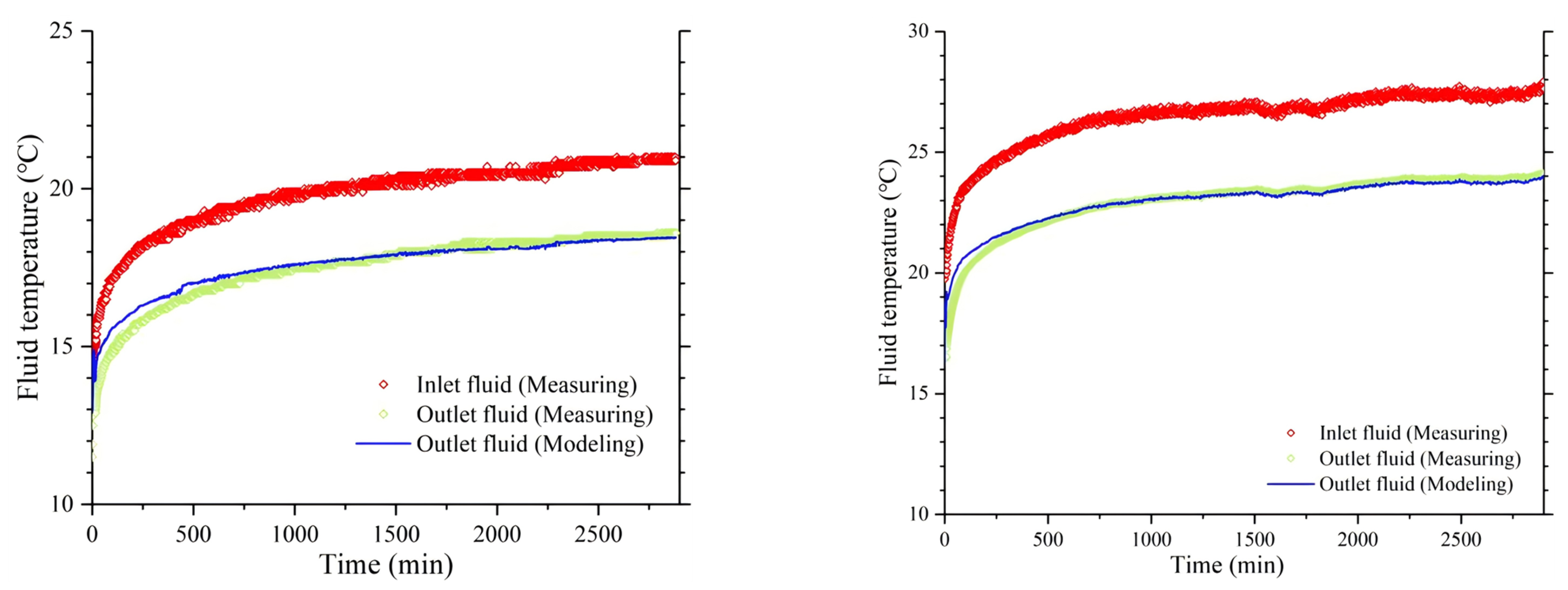 Figure 7 displays the numerical outputs and measurements for model validation. The acceptable error is about 2.0% of the measured fluid outlet temperature due to the impreciseness of the flowmeter, temperature sensor, and data noise. The uncertainty of the temperature sensors was estimated to be 0.20 °C. The RMSE values were 0.184 °C for the Qingyang case and 0.173 °C for the Tianshui case. It is proved that the numerical models are within the acceptable tolerance, suggesting the two FEFLOW models can reasonably predict long-term performance of BHEs.
