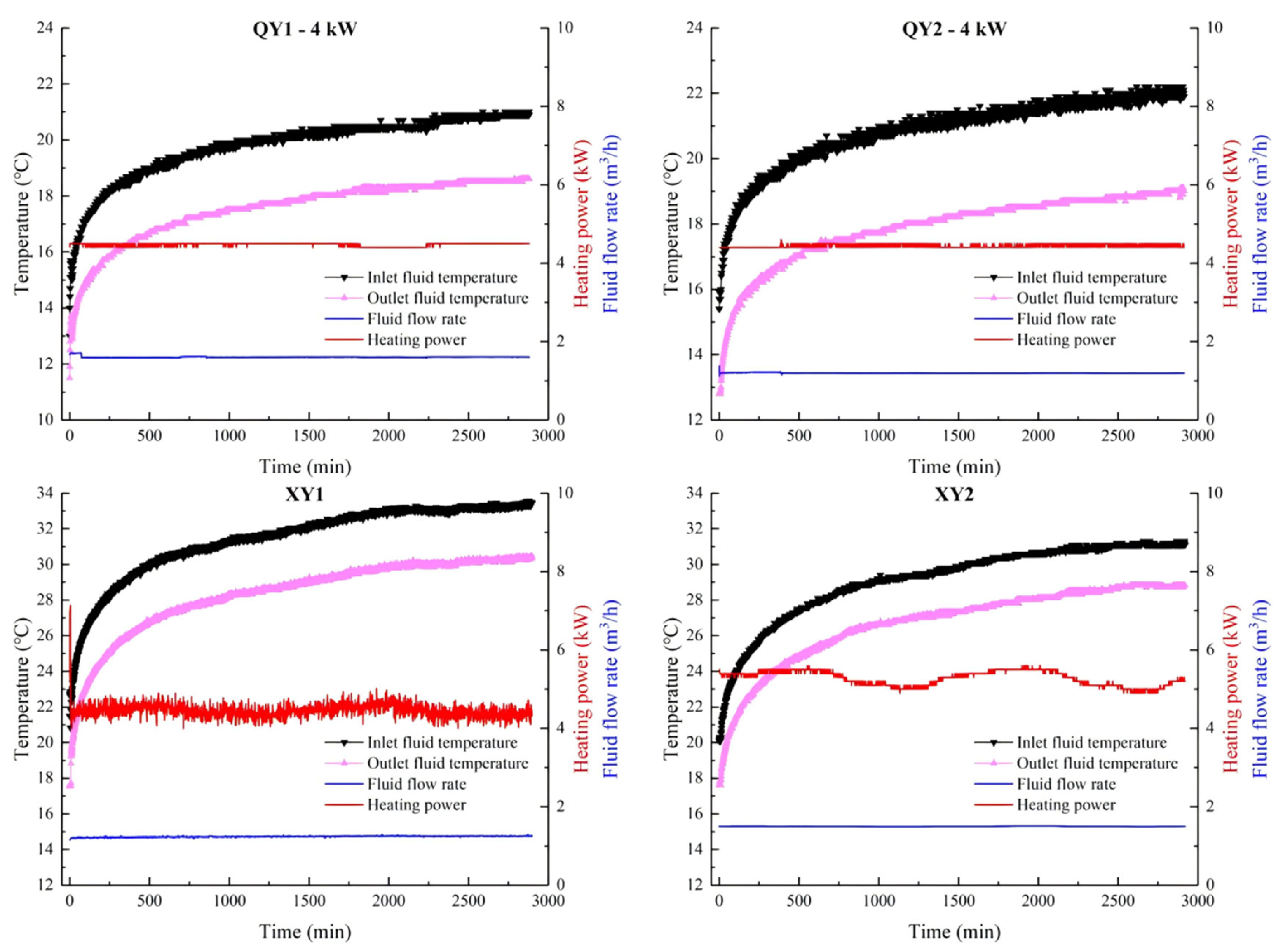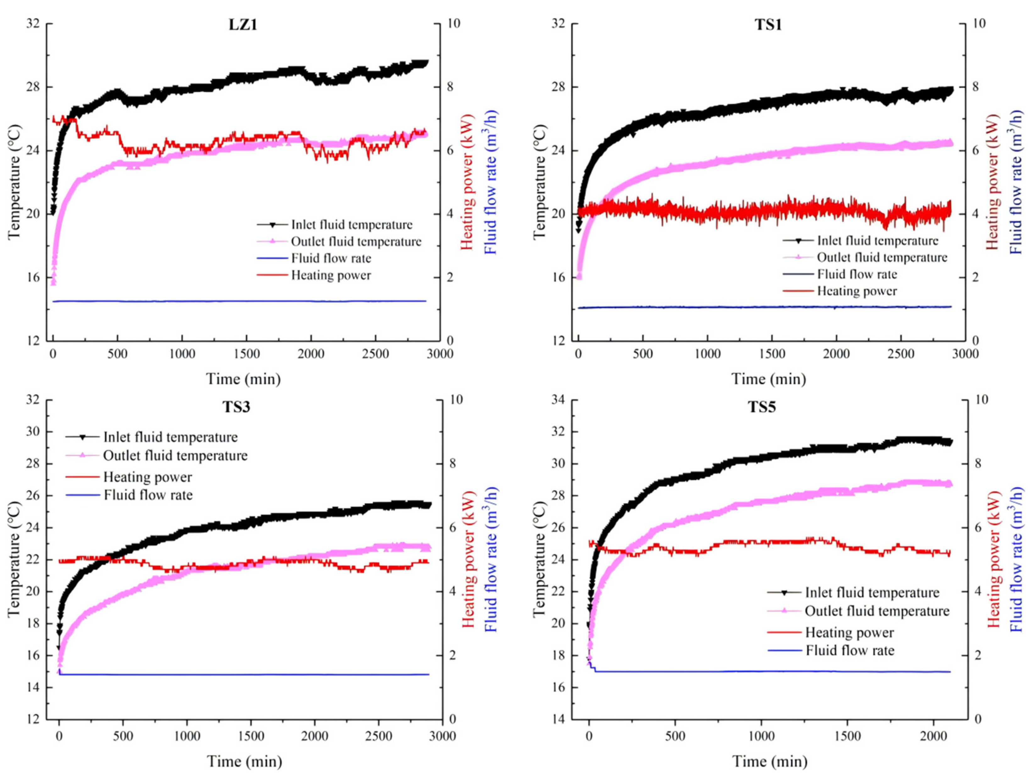Two sets of TRTs were carried out respectively on the River Terraces and the Loess Plateau in the study area. The records of eight TRTs are presented in