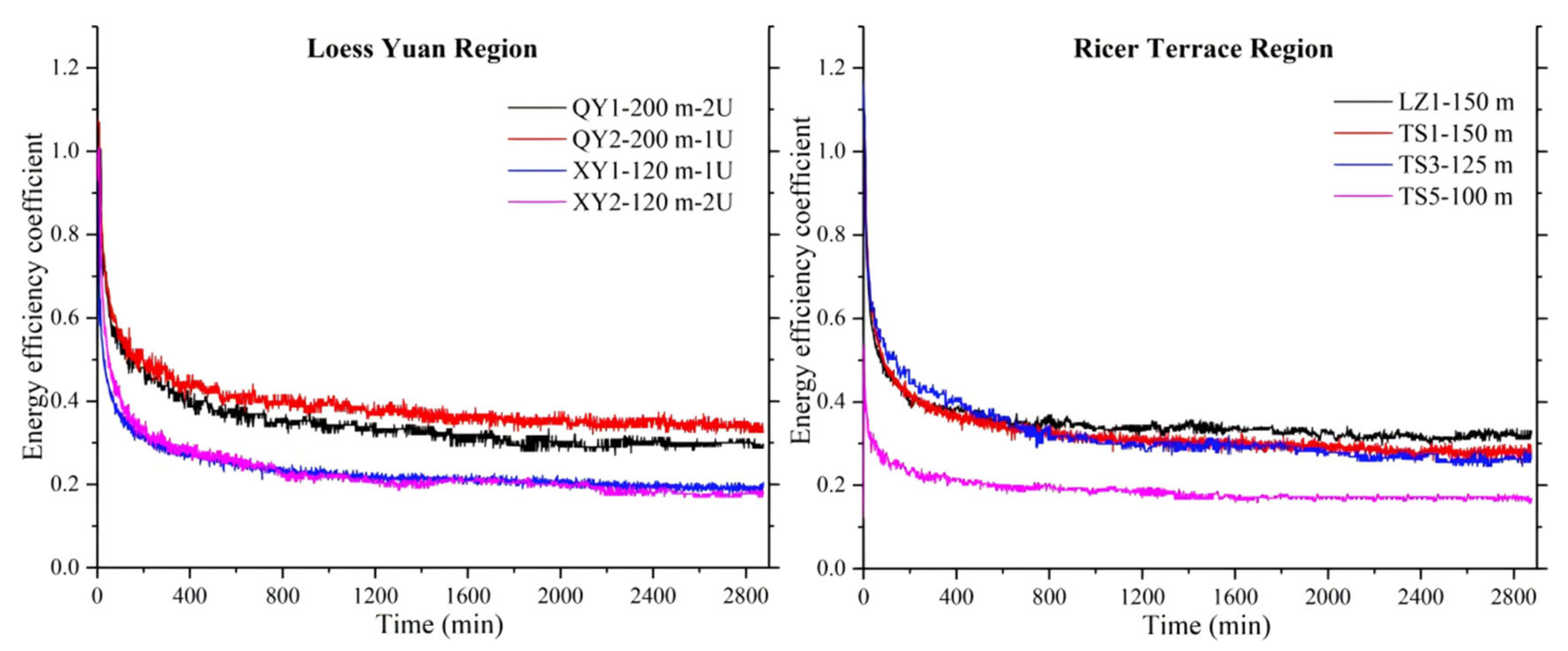 The energy efficiency coefficient characterizes the ability of a BHE and is a reflection of the heat capacity of the BHE, which is related to its geometric configuration parameters, ground thermal properties, and ground conditions. The expressions are simply formulated as follows [