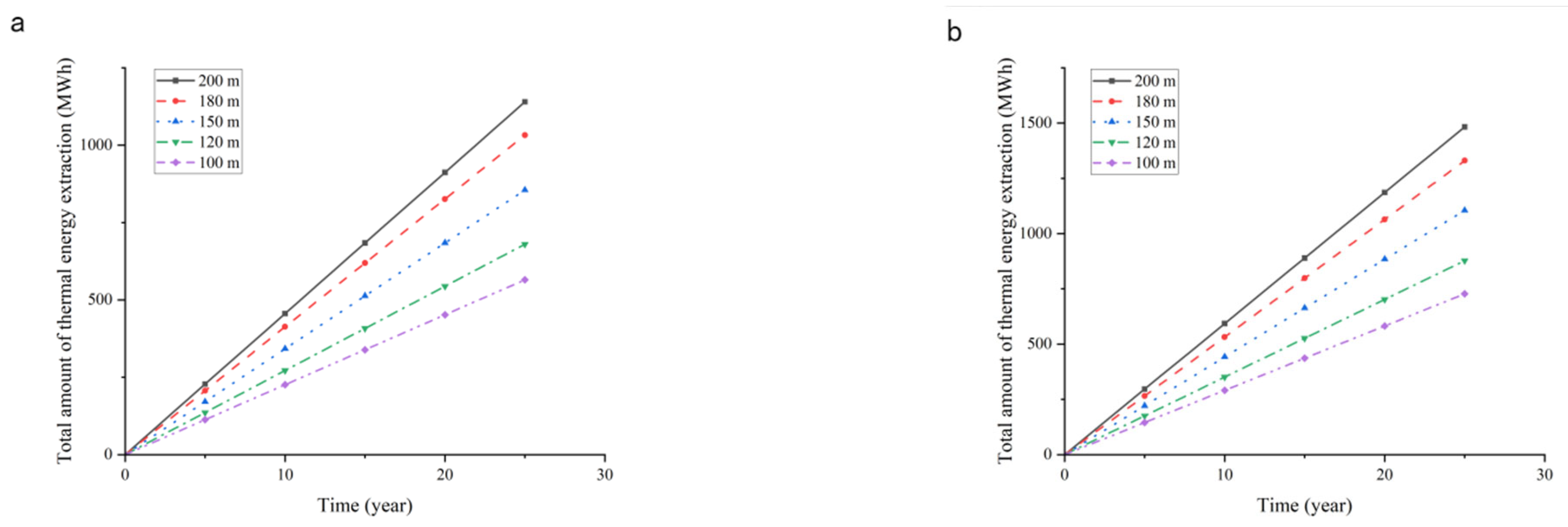 9] simulated a GCHP system built in Beijing under different load ratios. After 10 years, the soil temperature reduced by about 3.0 °C with a heating load-to-cooling load ratio of 2.4, and by about 4.5 °C when the ratio was 3.65. When minor thermal imbalance occurs in a BHE, adjusting the borehole length can help to mitigate it. A ten-year simulation showed that increasing borehole depth from 80 m to 120 m reduced the ground temperature drop from 8.4 °C to 6.5 °C [