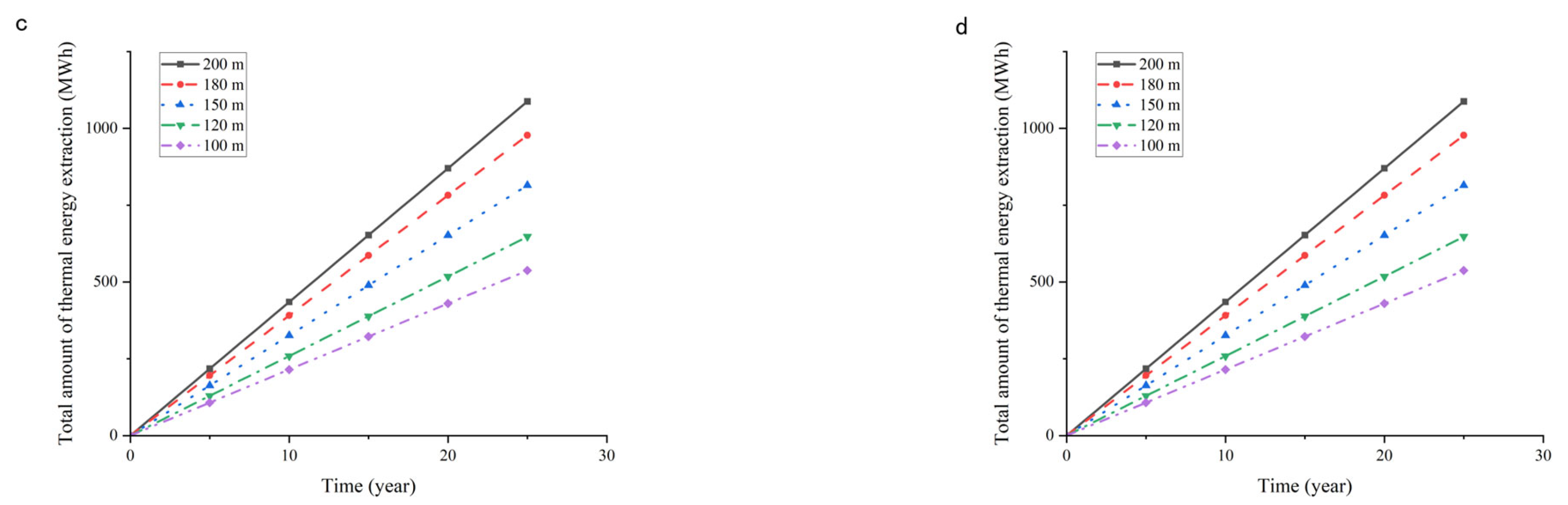 9]. However, previous research has focused mainly on the operation strategies to mitigate thermal performance reduction, such as employing hybrid systems, e.g., solar-assisted heating, to compensate for the ground heat imbalance. Those measures have limitations, their effectiveness is often constrained on cloudy days or at night, and they can significantly increase capital costs. Therefore, increasing the initial ground temperature becomes a key alternative. In this study, to achieve higher initial ground temperature and more stable thermal performance of BHEs, we leverage the geothermal gradient effect by increasing the borehole depth. This approach inherently accesses higher initial ground temperatures, thereby enhancing system performance.