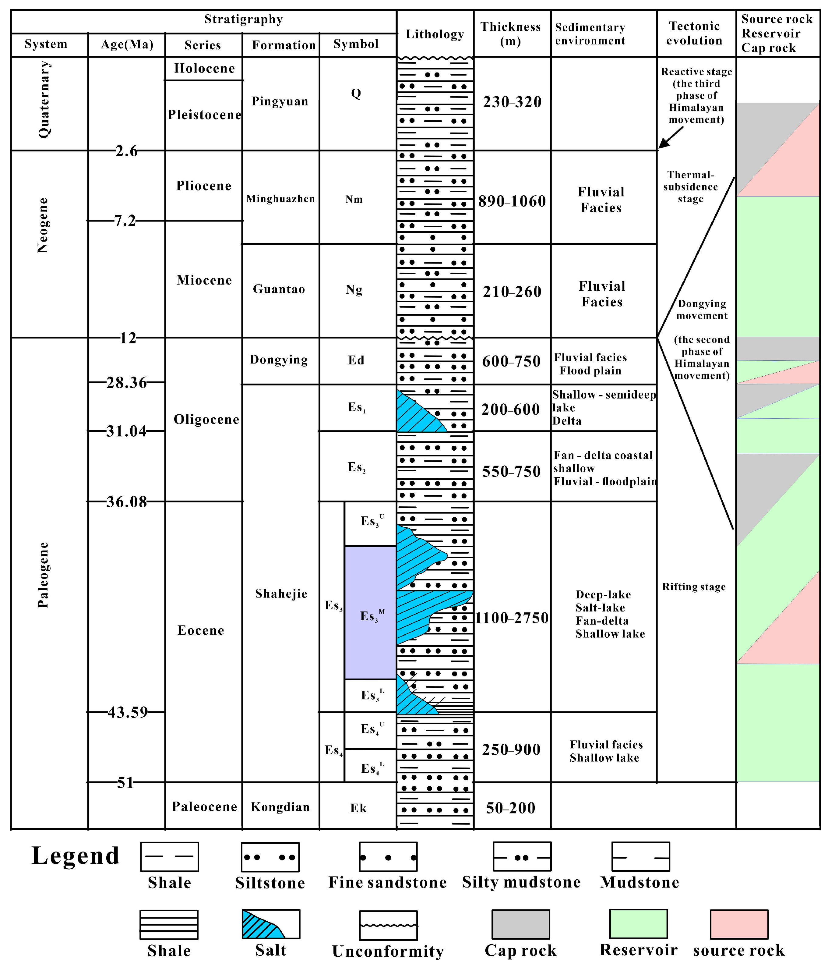 - Huang, J.J.; Ji, Y.L.; Wang, G.W.; Chen, F.L.; Han, F.M. Sequence characteristics and genesis of the Eogene salt-bearing formation in Dongpu depression. Oil Gas Geol. 2007, 28, 479–484. (In Chinese) [Google Scholar] [CrossRef]