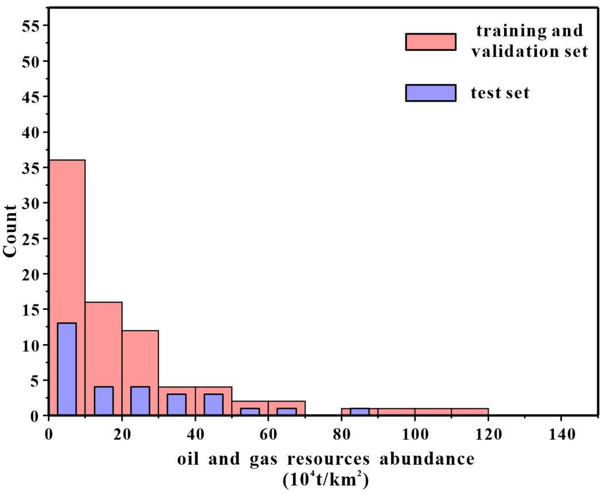 - Quantitative Analysis of Uncertainty: The model developed in this study is applicable to adjacent blocks within sag areas, where the reservoirs are expected to exhibit conventional characteristics, including porosity ranging from 10% to 20% and permeability between 1 mD and 50 mD. Notably, the range of the target parameter—oil and gas resource abundance—is of paramount importance. The dataset collected for this study shows that the distribution of oil and gas resource abundance mainly spans from 0 to 50 (×104 t/km2), with a lack of high-oil and gas resource abundance data, which limits the model’s ability to effectively predict high-oil and gas resource abundance regions. To enhance the model’s performance and address high-resource abundance areas, future research should incorporate uncertainty quantification techniques (such as Bayesian methods) to better capture the variability in these regions and optimize the predictive model accordingly. This would strengthen the machine learning model’s ability to handle high-resource abundance areas. For other regions, a new database should be established based on local geological characteristics, and the machine learning algorithms proposed in this study should be employed to reconstruct evaluation and prediction models.