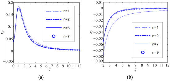 The Scarborough criterion is used to estimate the solution accuracy, where is the relative percentage error and is the tolerance, ensuring the correctness of at least the first m significant digits. Since the coating/substrate system consists of PZT-5 and zinc oxide, profiles of and along the interface for different iterations n are plotted in Figure 2.