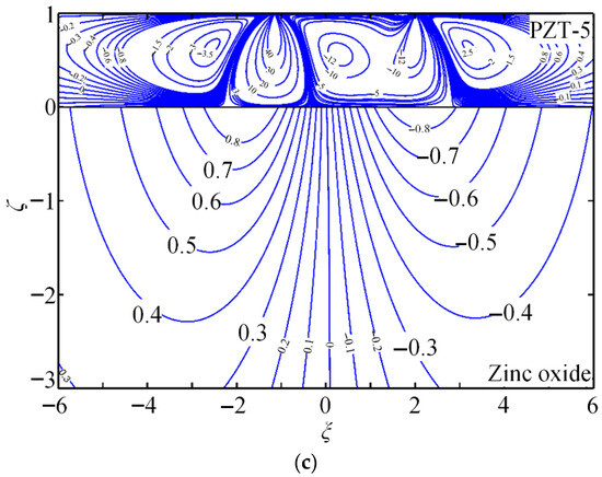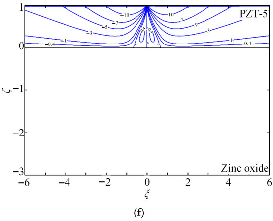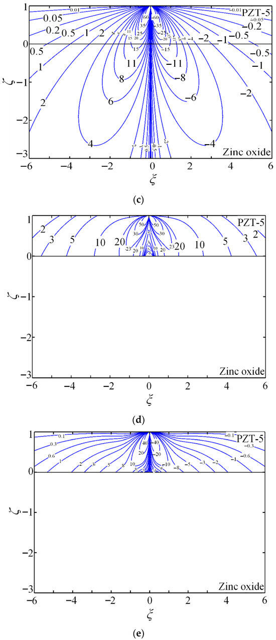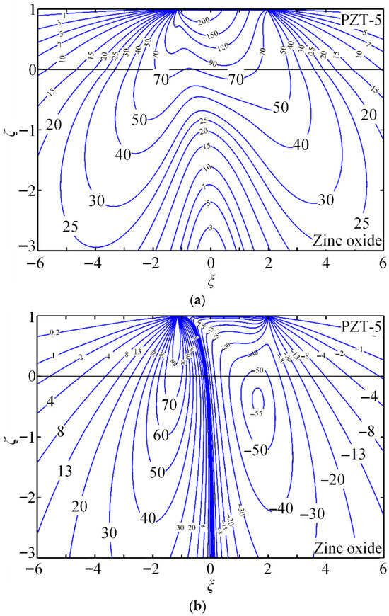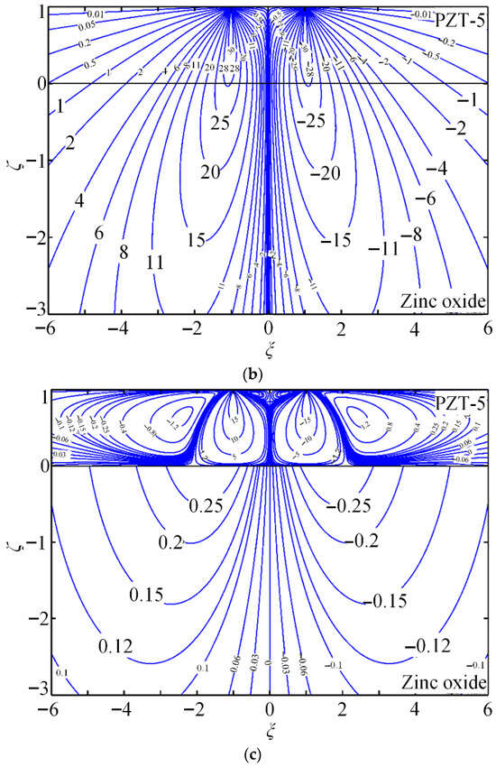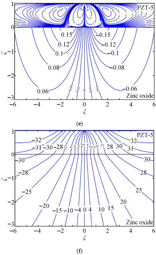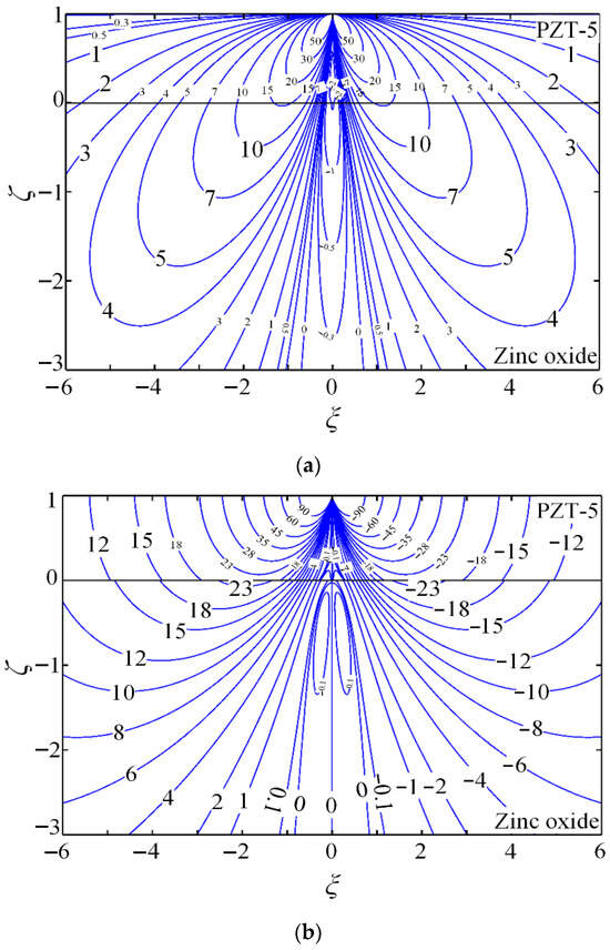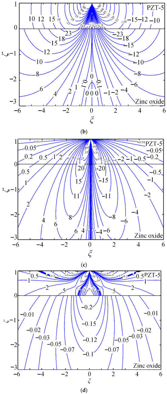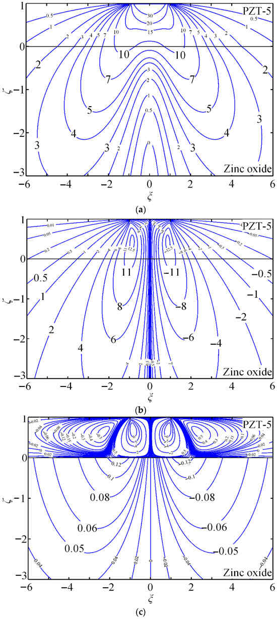 The contours of the non-dimensional Green stress components , , and , electric displacements and , and electric potential are presented to demonstrate the quantitative capability of the proposed method. PZT-5 is used as the coating, while zinc oxide (dielectric) or hexagonal zinc (electrical conductor) serves as the substrate. Figure 4 shows the coupled-field component contours for piezoelectric energy harvesters composed of PZT-5 piezoelectric ceramic coating and zinc oxide substrate (dielectric) under a tangential line force.