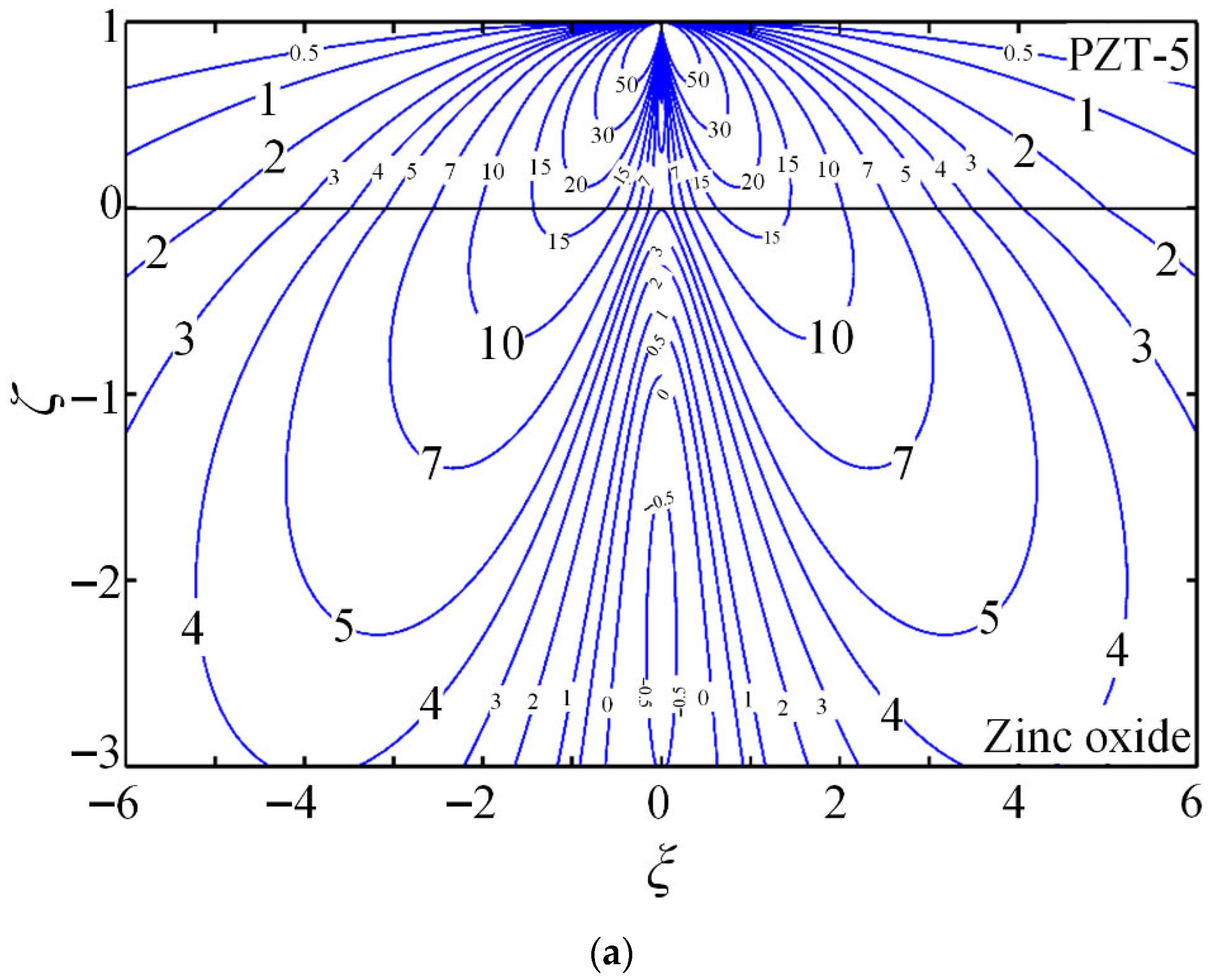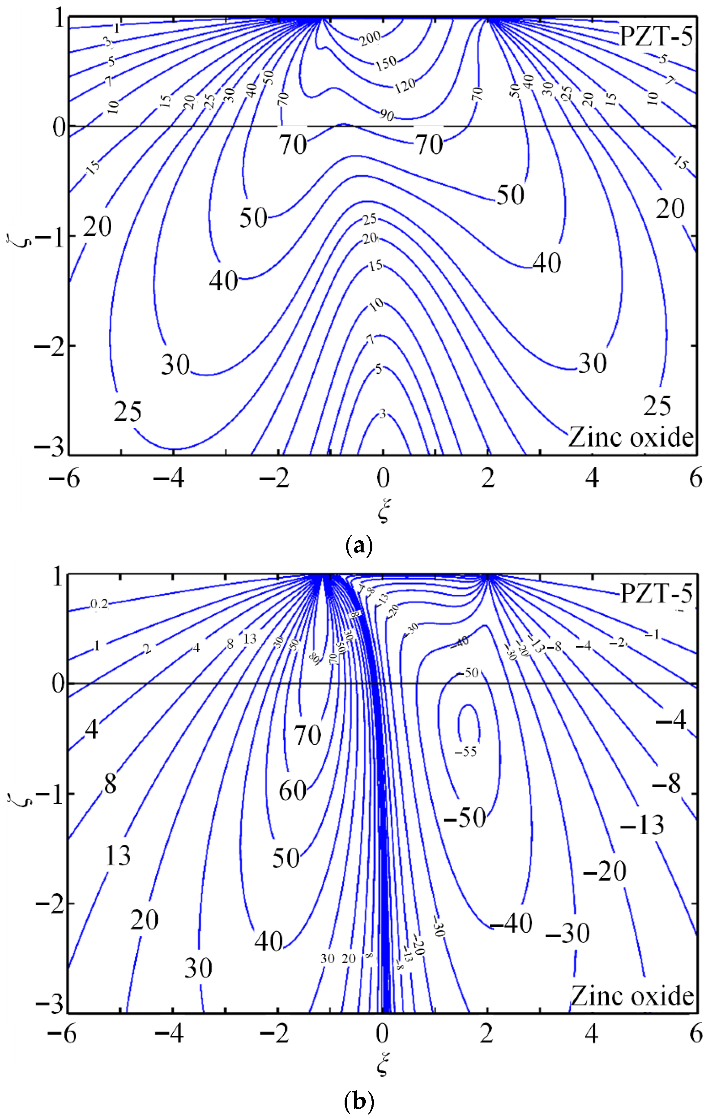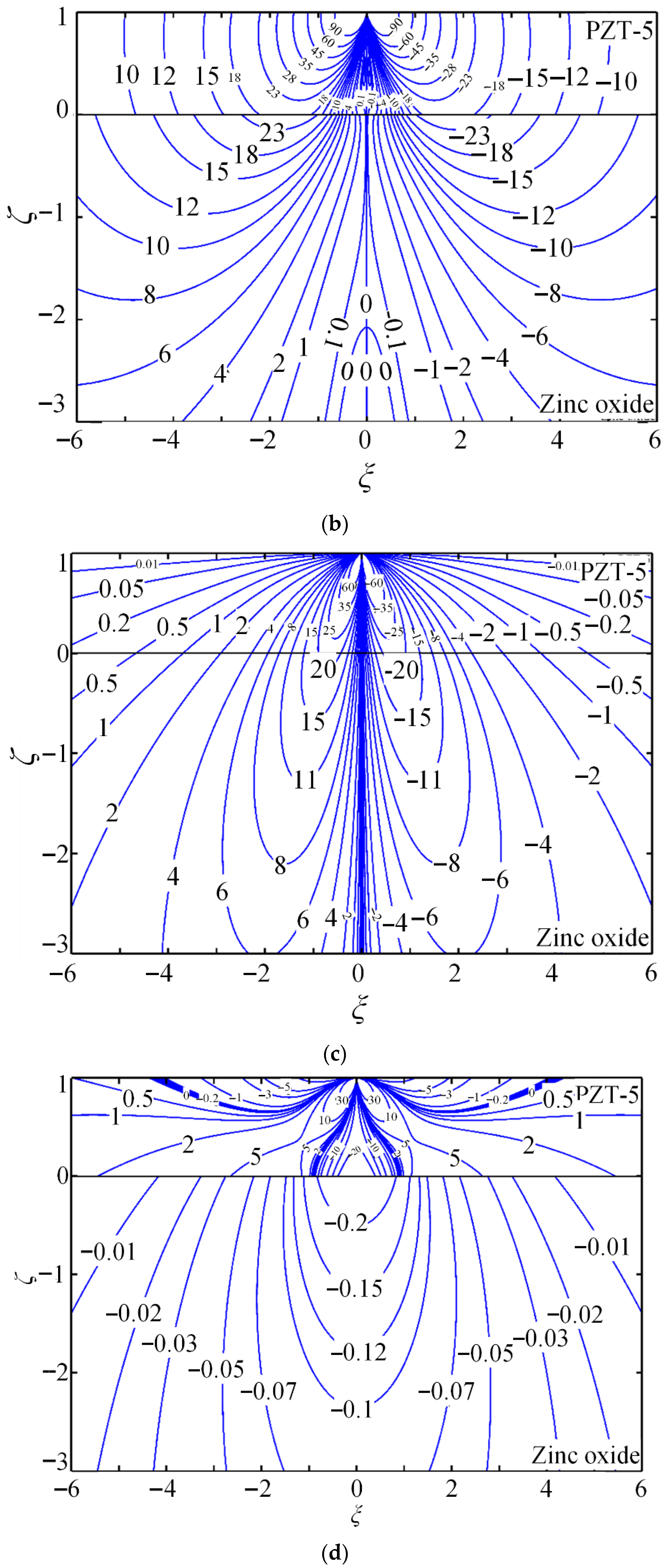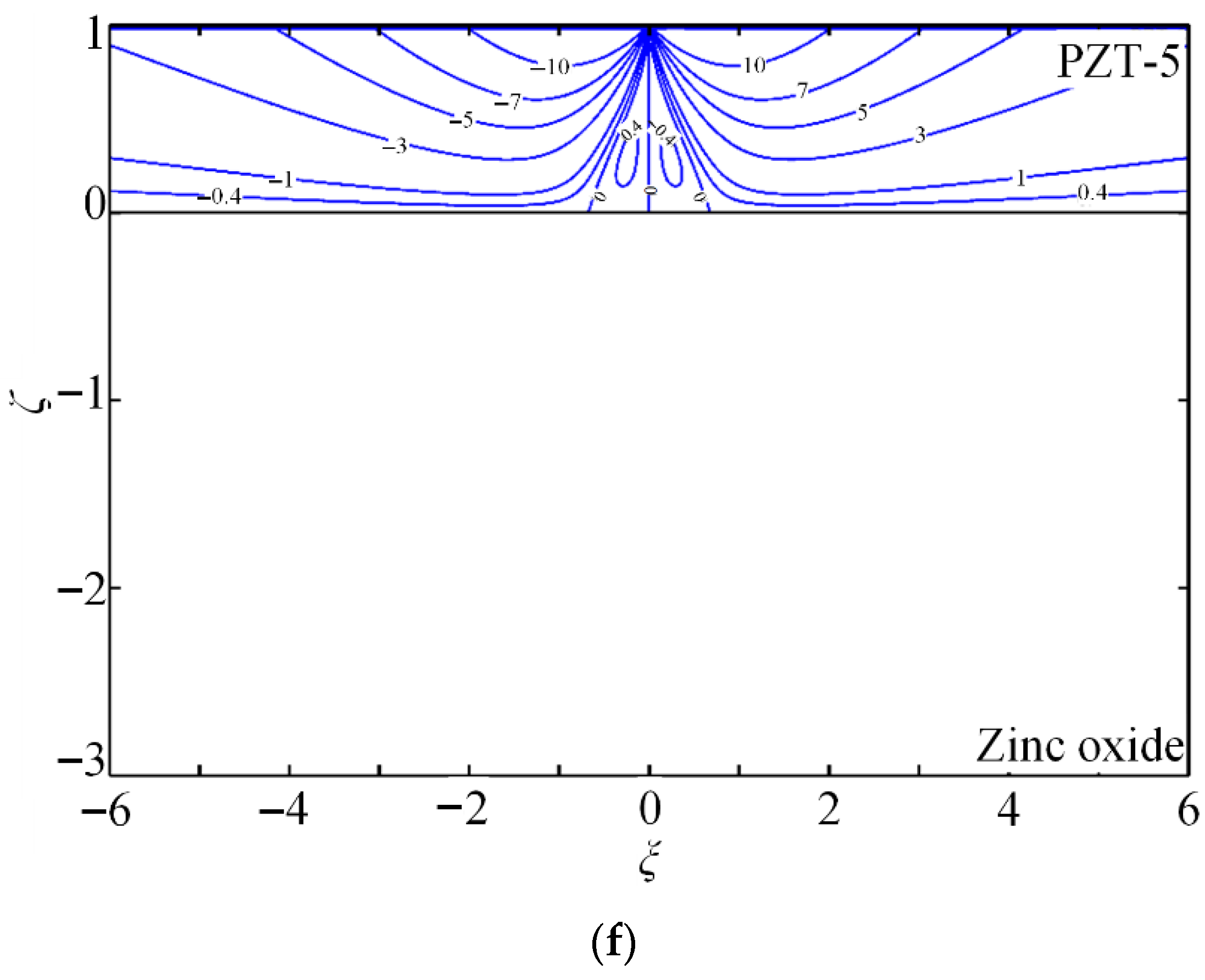 4.3. Stress Component and Electric Displacement Contours with the Tangential Line Force