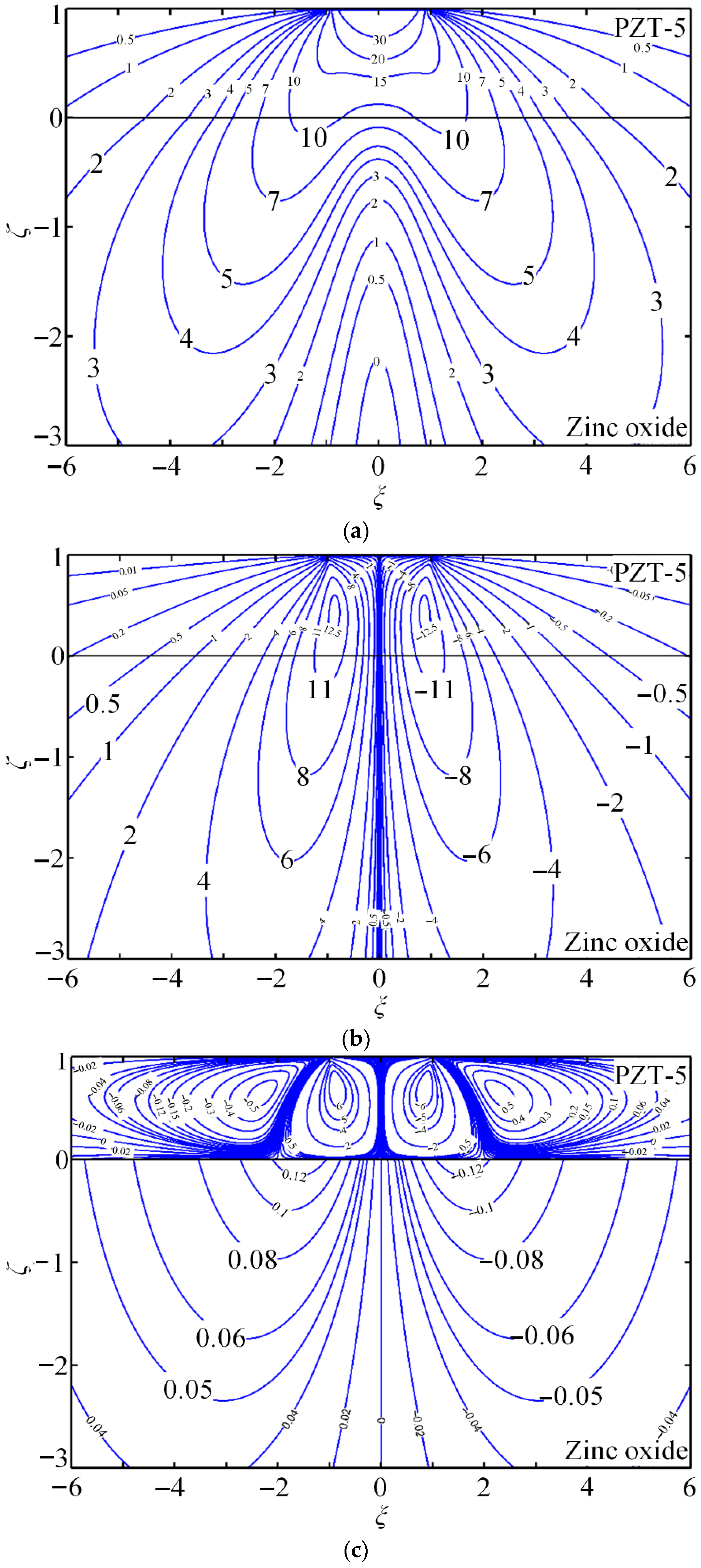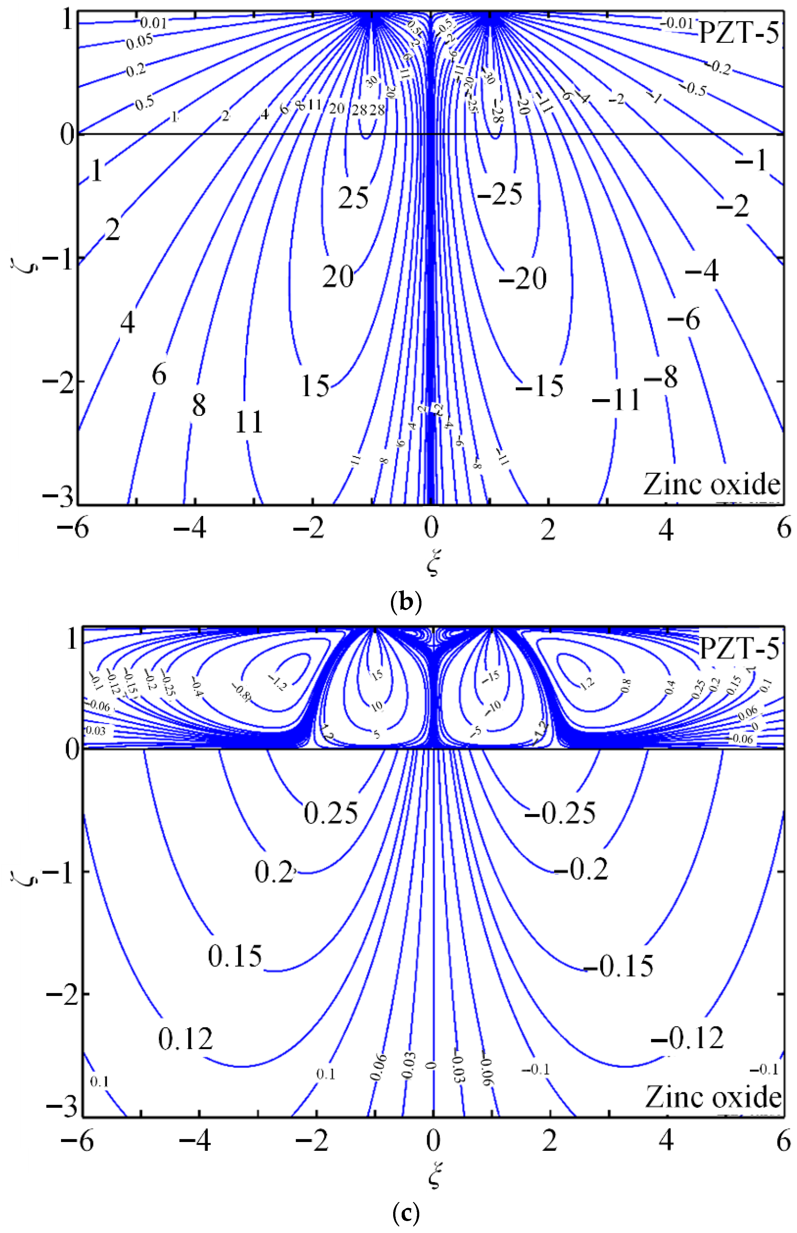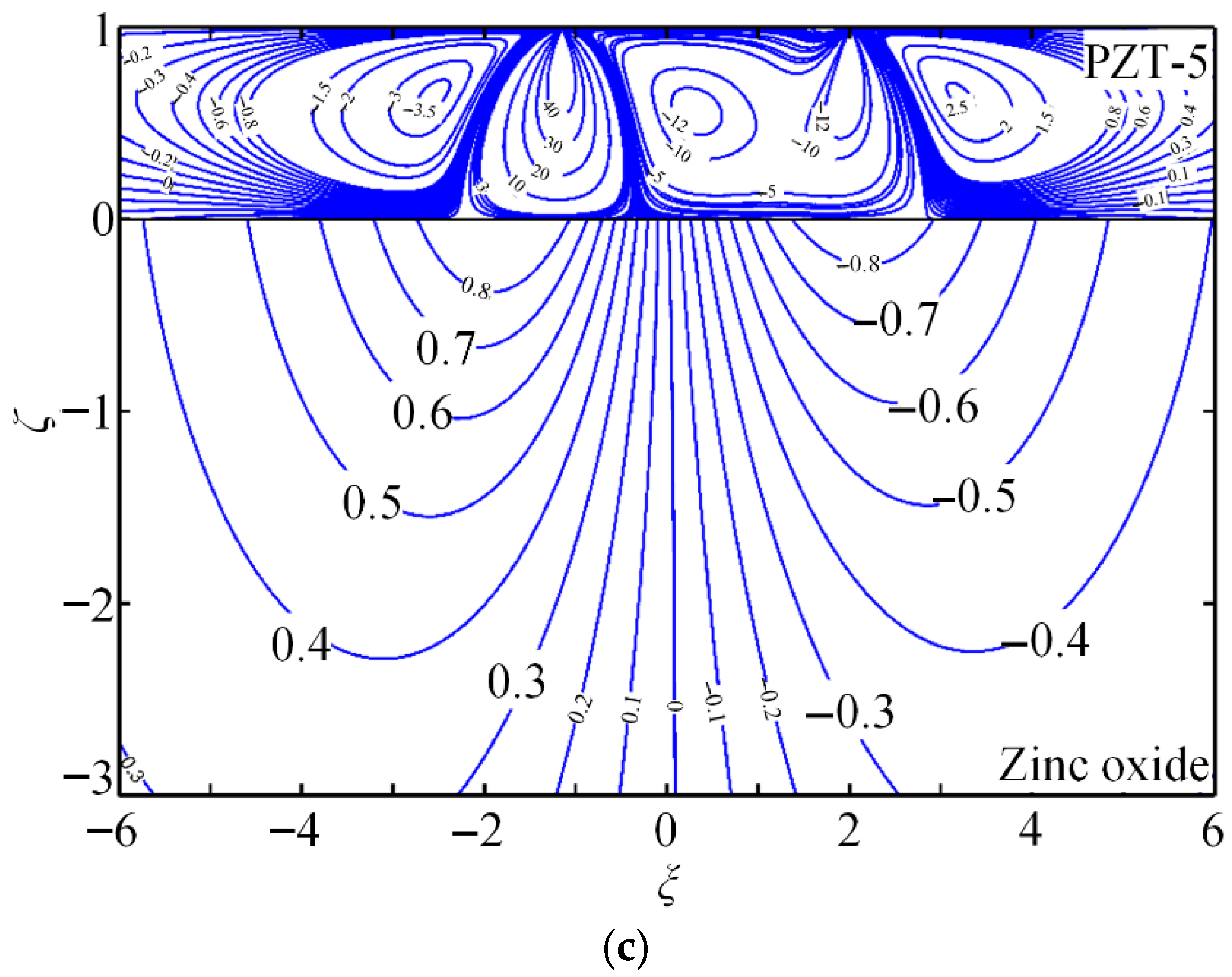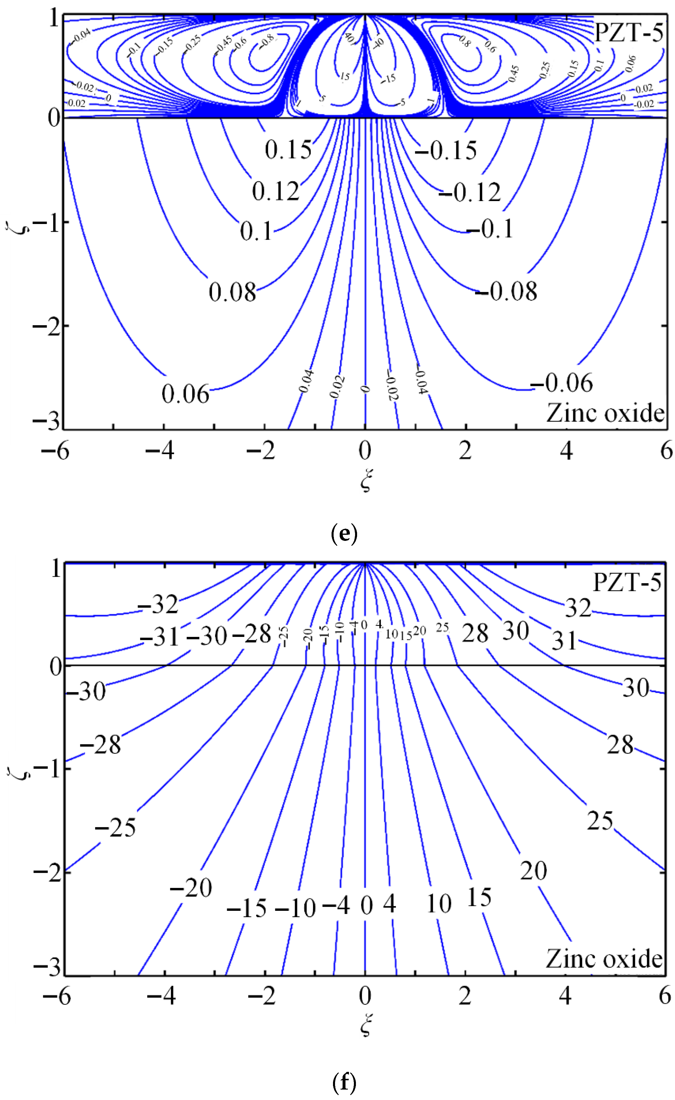- Shear stresses are shown in Figure 4a and Figure 5a, normal stresses are shown in Figure 4c and Figure 5c, electrical displacements are shown in Figure 4e, and potentials are shown in Figure 4f, which show interfacial continuity, conforming to interfacial continuity Equation (20). However, the gradient of the above components shows interfacial discontinuity; as a result, contours are angled during interface crossing. This can be attributed to interfacial effect resulting from various coating–substrate material characteristics, which can be even apparent within contours for electrical displacements . Normal stresses from Figure 4b and Figure 5b and electrical displacements from Figure 4d are identical owing to interfacial discontinuity. In addition, a hexagonal zinc substrate serves as the electrical conductor with interfacial distribution of free charge because of the polarization effect. This substrate is the equipotential body ( from Figure 5f) without electric displacement components ( from Figure 5d, from Figure 5e).