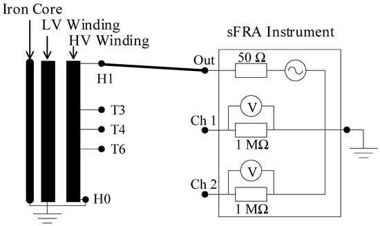 To assess the voltage distribution within the winding across a range of excitation frequencies, voltage transfer functions were measured between the external terminal H1 and the three internal tap connections T3, T4, and T6. These measurements were conducted using the same sFRA instrument, but configured in gain mode. In this setup, both the output and reference (Ch 1) channels were connected to terminal H1, while the second measurement channel (Ch 2) was sequentially connected to each internal tap. The measurement configuration is illustrated in