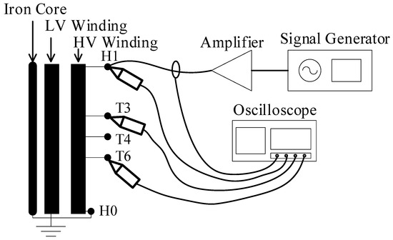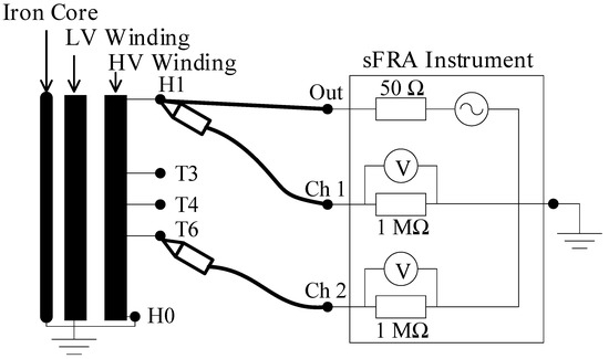 To minimize capacitive loading effects on the winding and preserve signal fidelity across the frequency range, voltage measurements were performed using 10:1 passive voltage probes (LeCroy PP005). Their input resistance of 10 MΩ and input capacitance of 11 pF increase the overall input impedance relative to the measurement instrument (1 MΩ), ensuring precise measurement of the internal voltage responses. The resulting H-matrix comprises a 3 × 1 set of transfer functions corresponding to taps T3, T4, and T6.